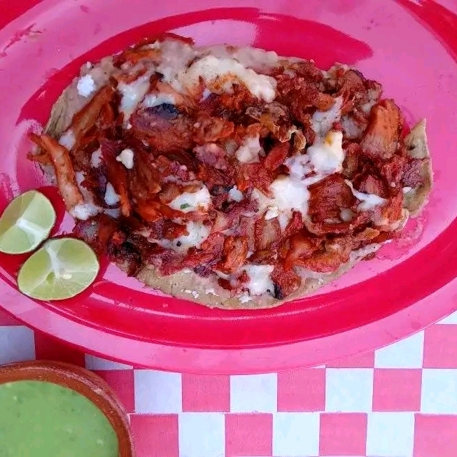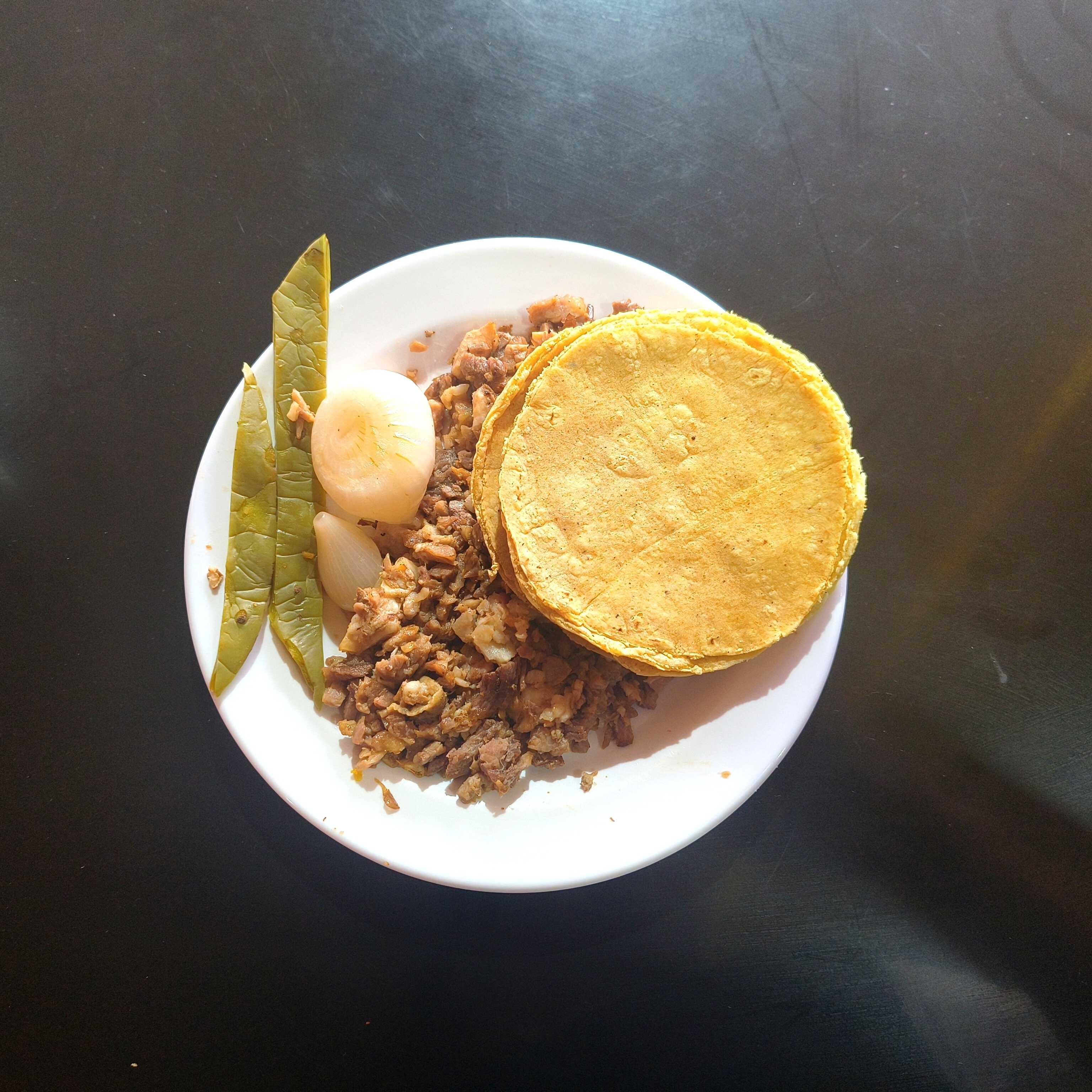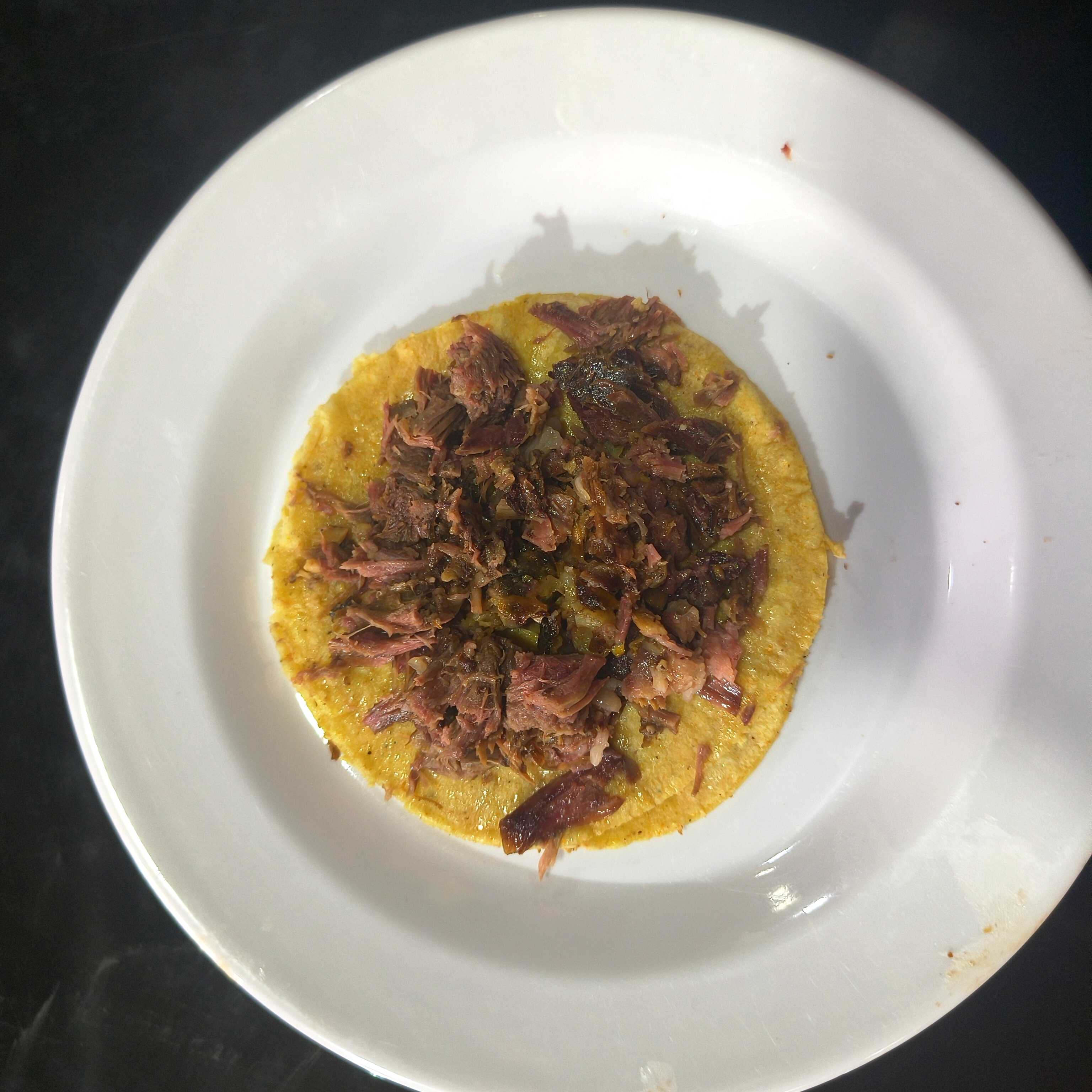 Carne de suadero confitada y picada servida en tortilla estilo árabe.