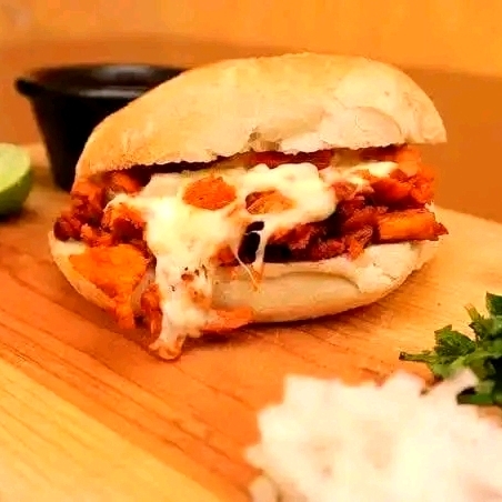 Telera rellena de milanesa de res o pollo, frijoles, aguacate y cebolla.