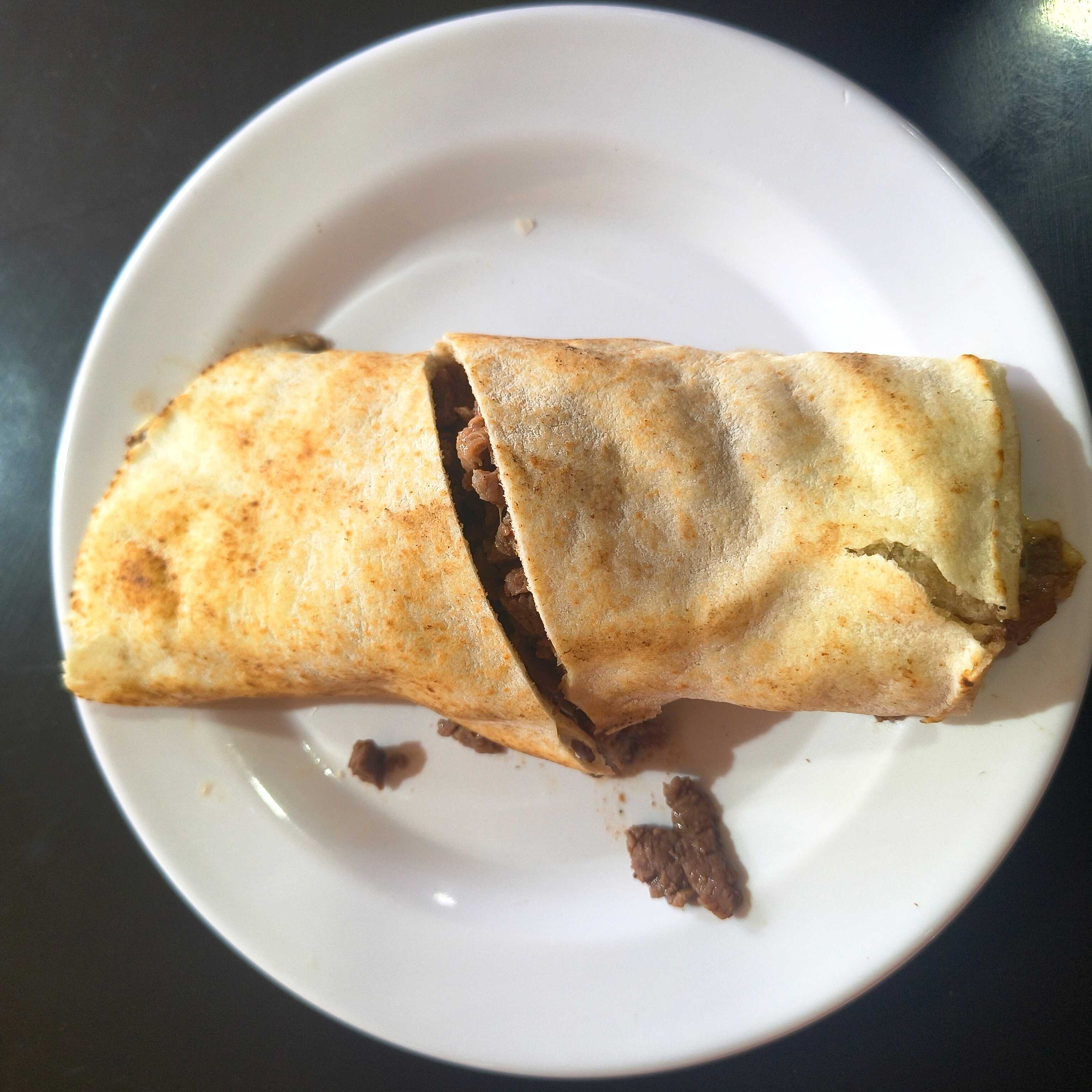 Jugosa carne de bistec de res servida en tortilla de harina tipo árabe.