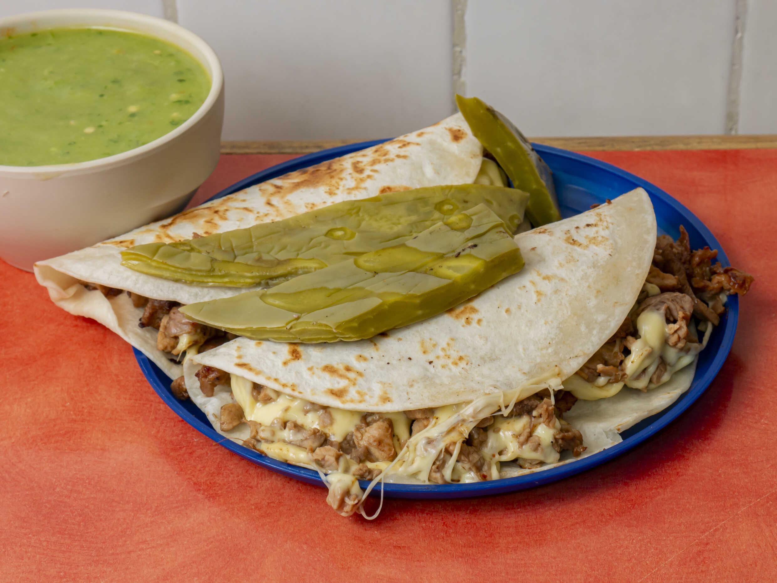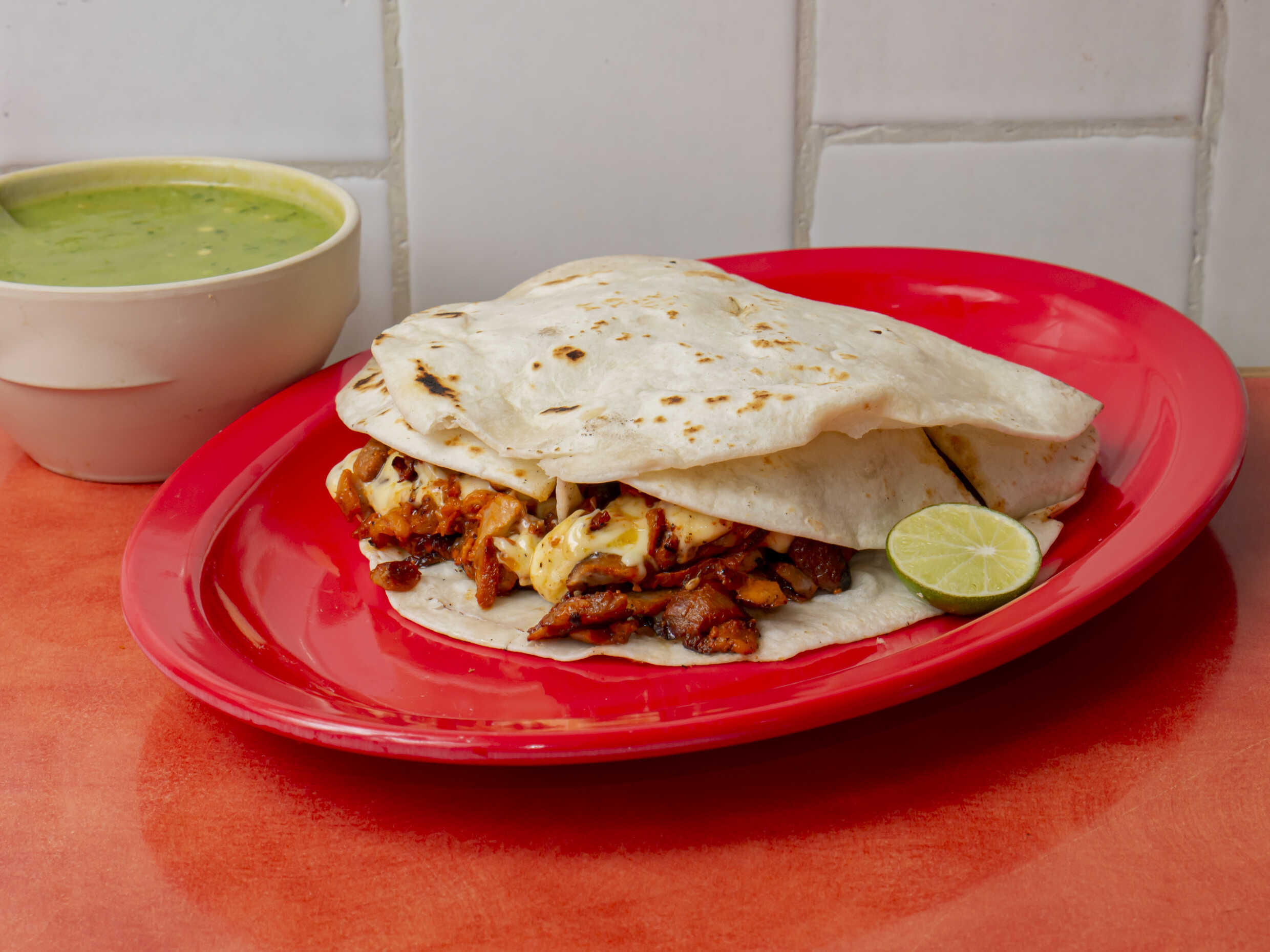 Pastor, queso y doble tortilla de harina.