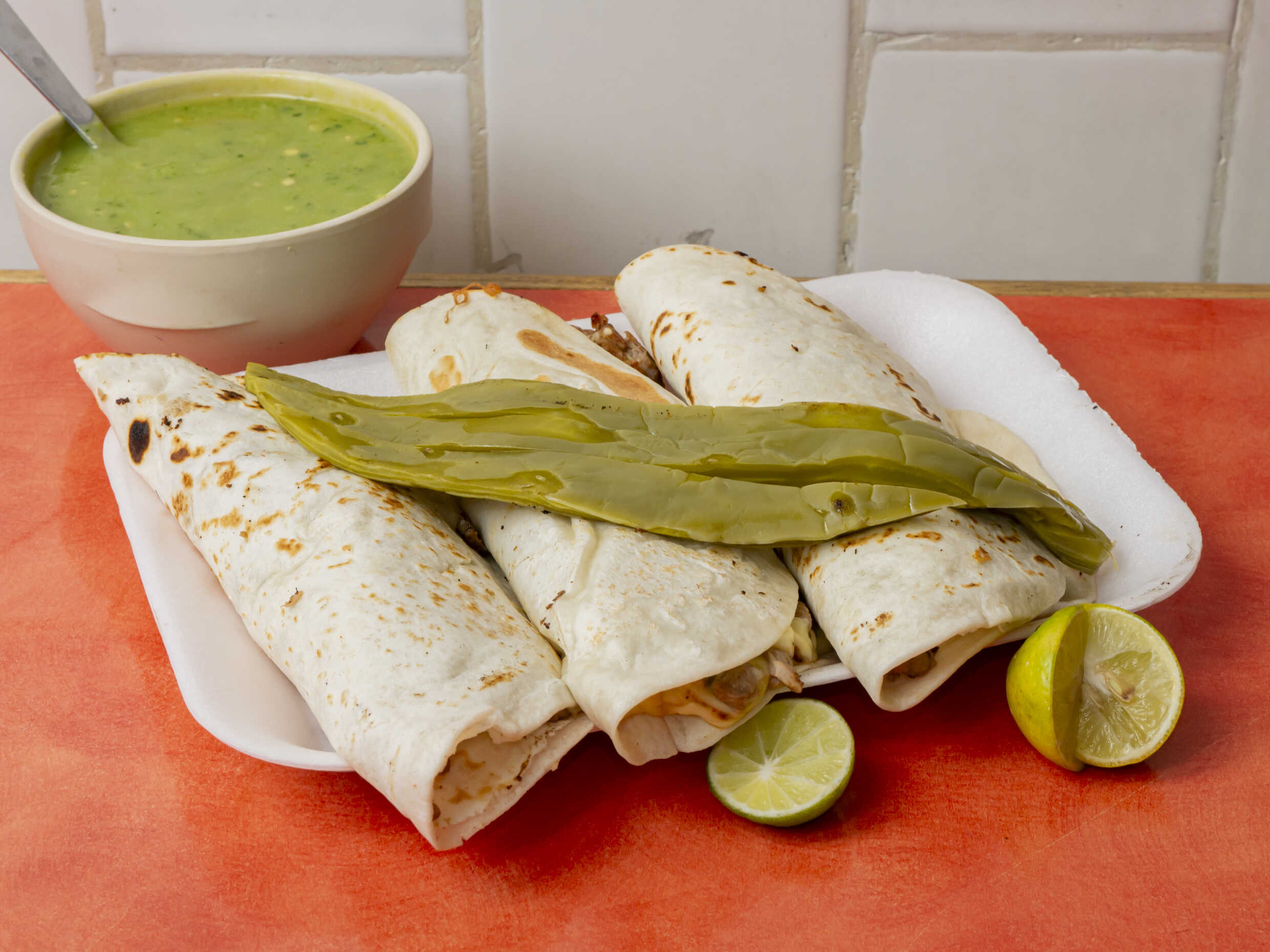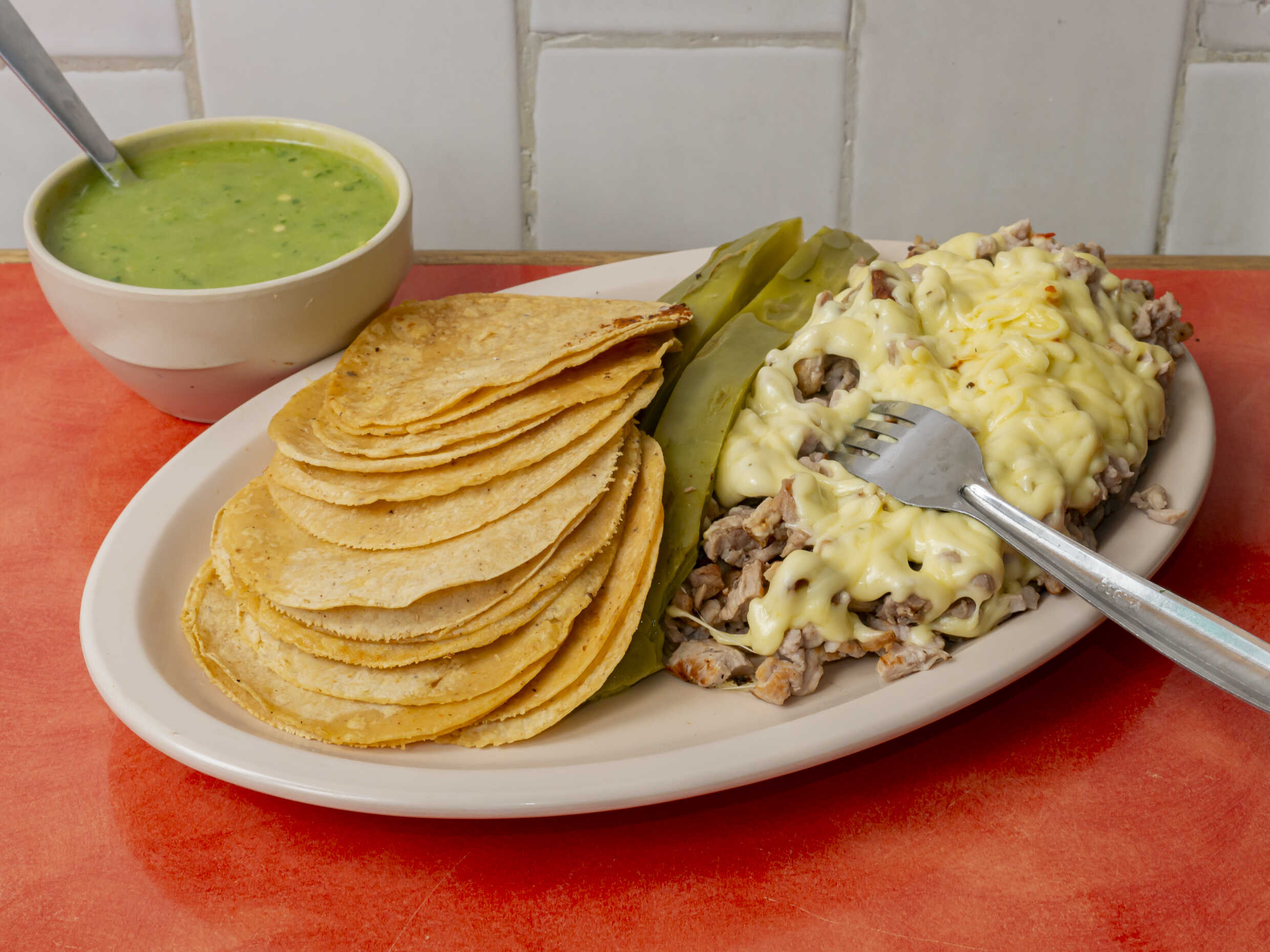 Suadero, cebolla, pimiento morrón y queso. Incluye tortillas y salsa.