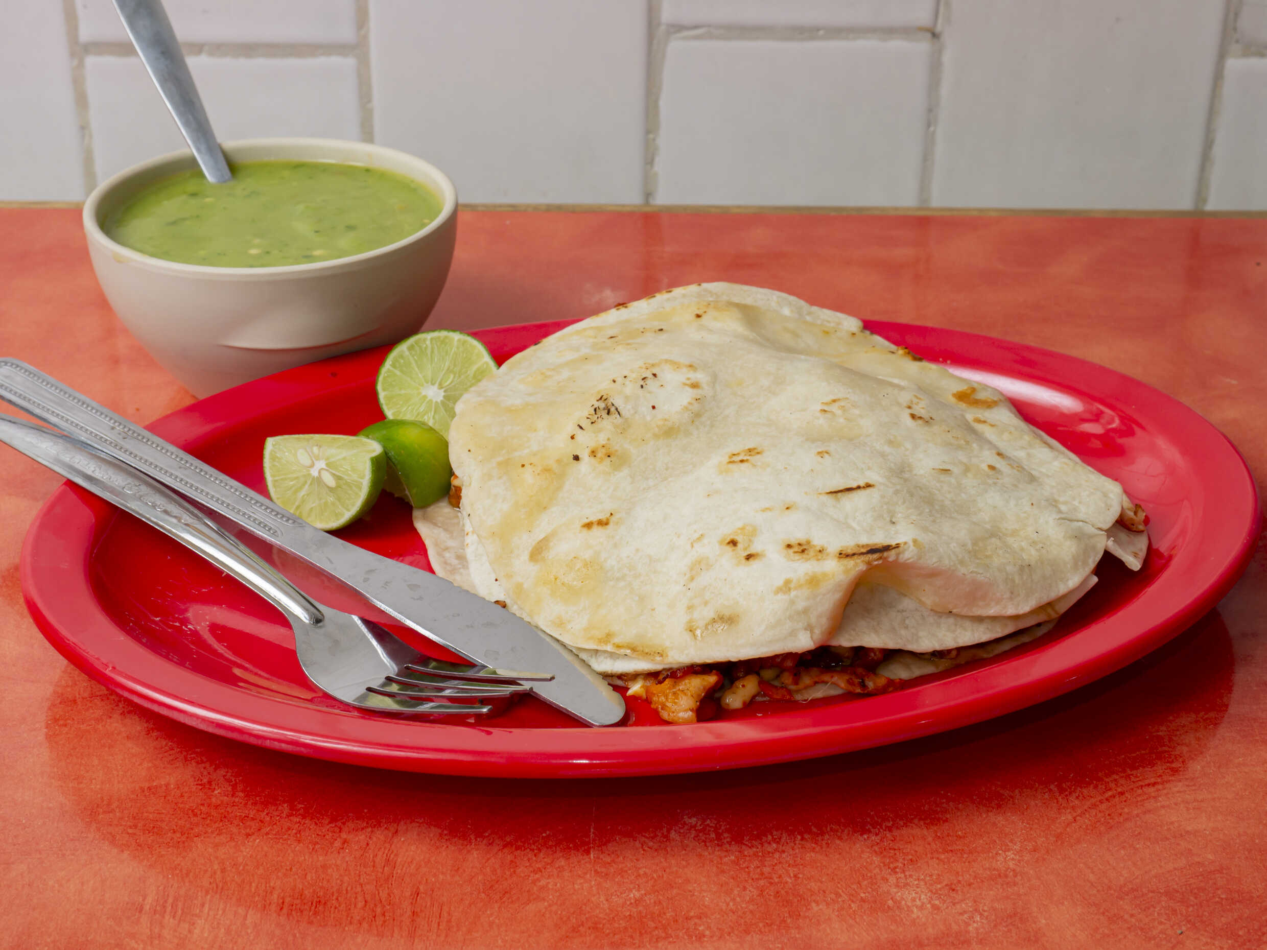 Arrachera o pollo, queso y doble tortilla de harina.