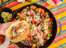 Arrachera, cebolla, pimiento morrón y queso. Incluye tortillas y salsa.