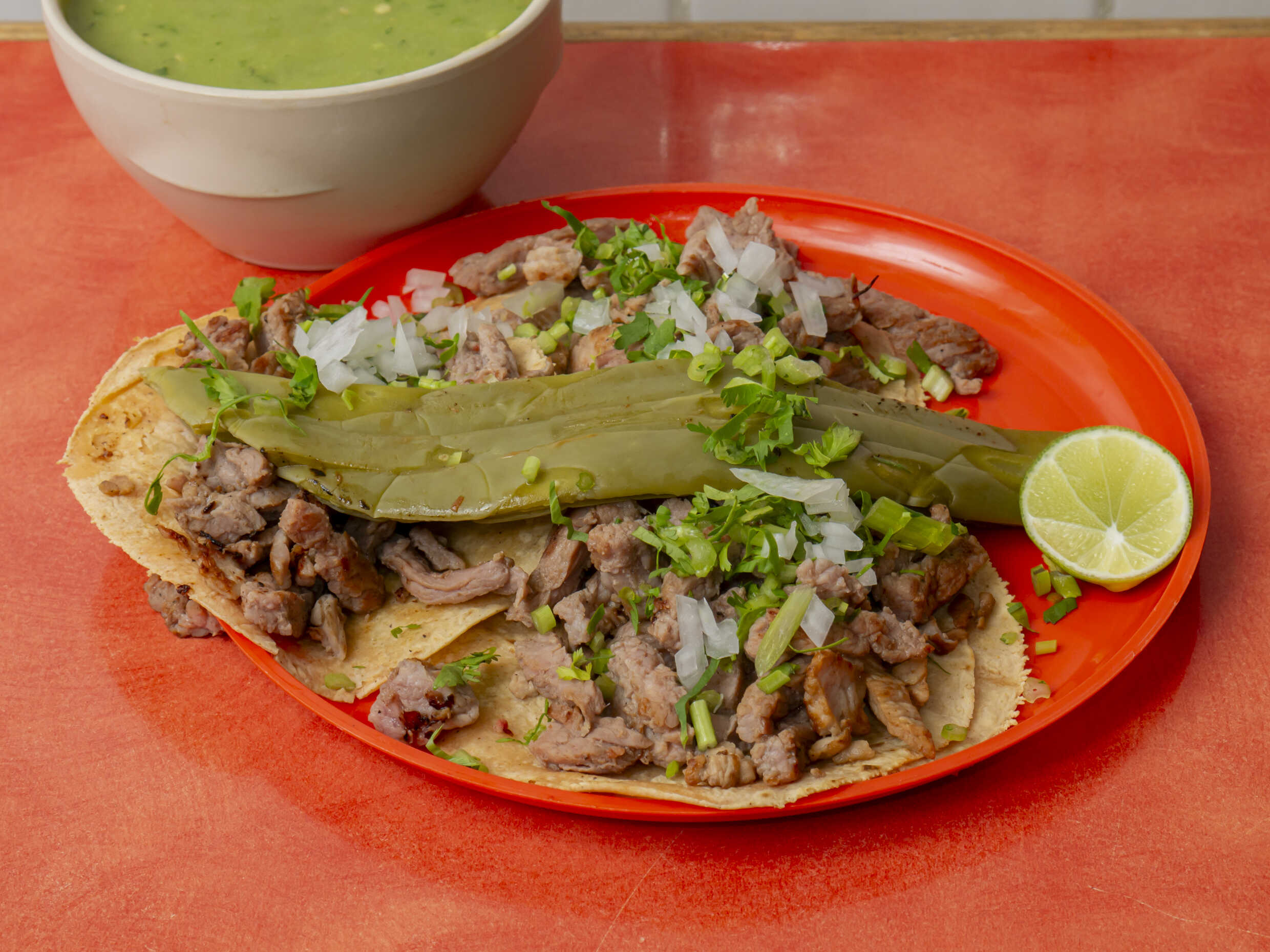 Suadero, cebolla y pimiento morrón. Incluye tortillas y salsa.