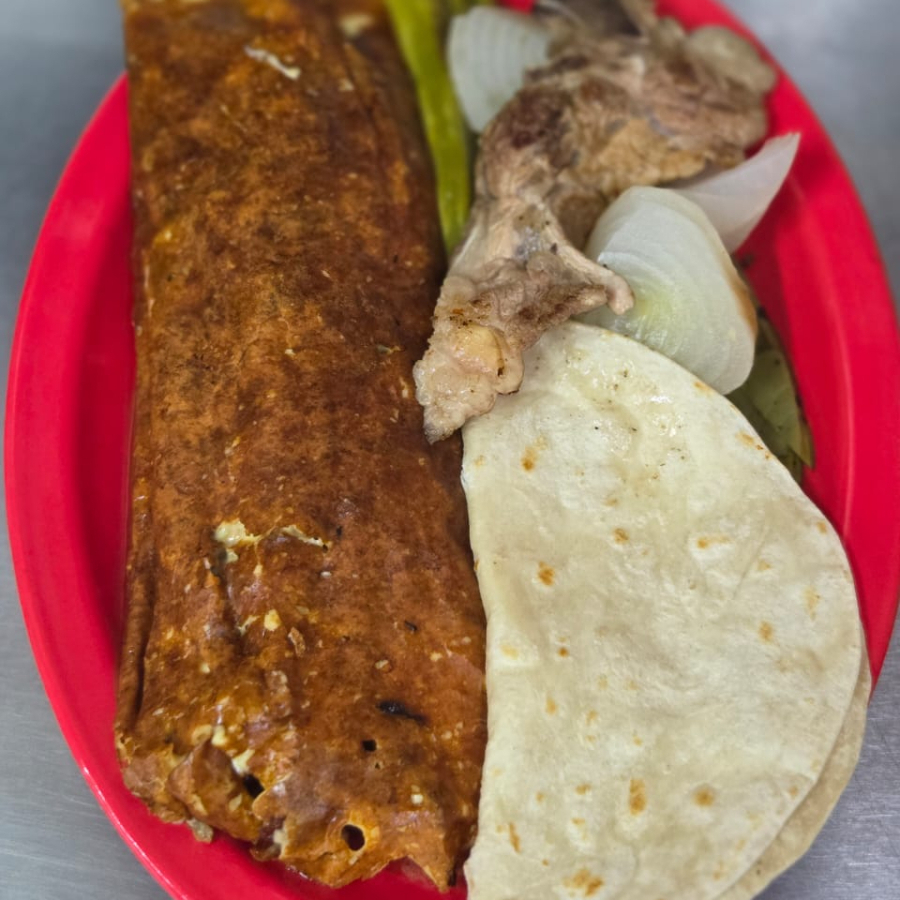 Chuleta, tocino, chorizo, pimiento morrón, cebolla, queso. Incluye tortillas y salsa.