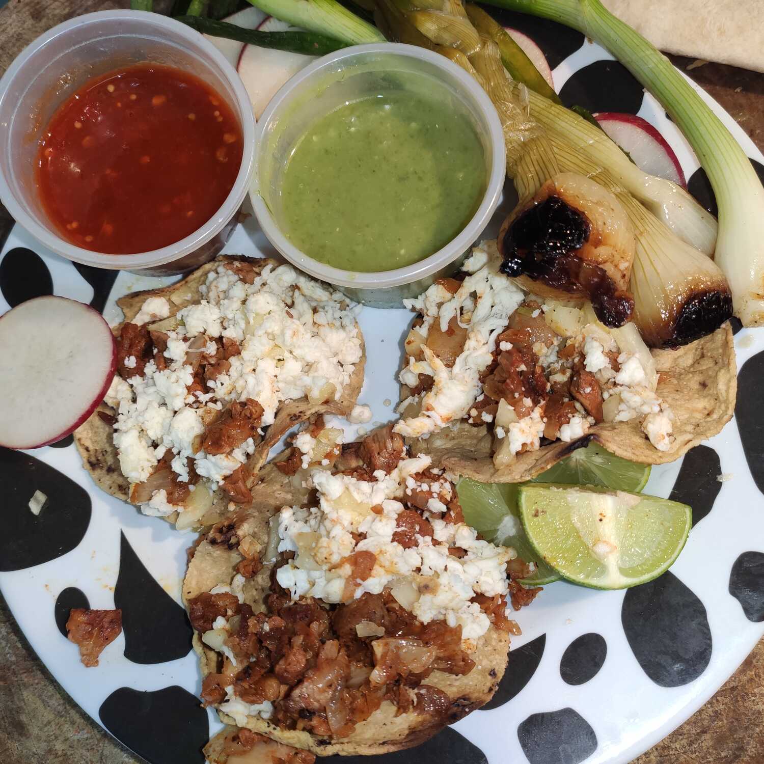Orden de 5 tacos blandos a base de maíz con carne (100g) al pastor de primera calidad acompañados de cebolla, cilantro, salsa de tu preferencia y limones.(Porción personal)