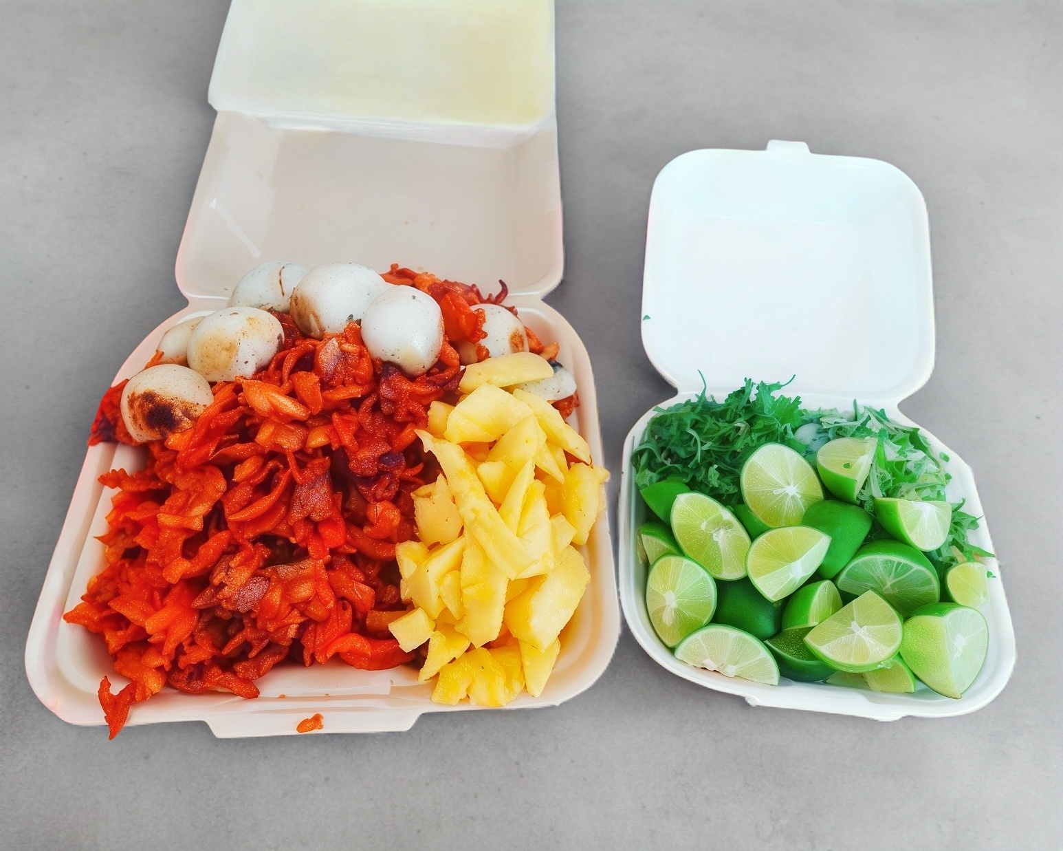 Un kilo de carne de al pastor, suadero y longaniza acompañado con 15 pares de tortillas de maíz, verdura, nopales, cebollitas de cambray y salsa.