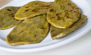 Taco de tortilla grande con pechuga, cebolla y nopales cocidos, verdura y salsa.