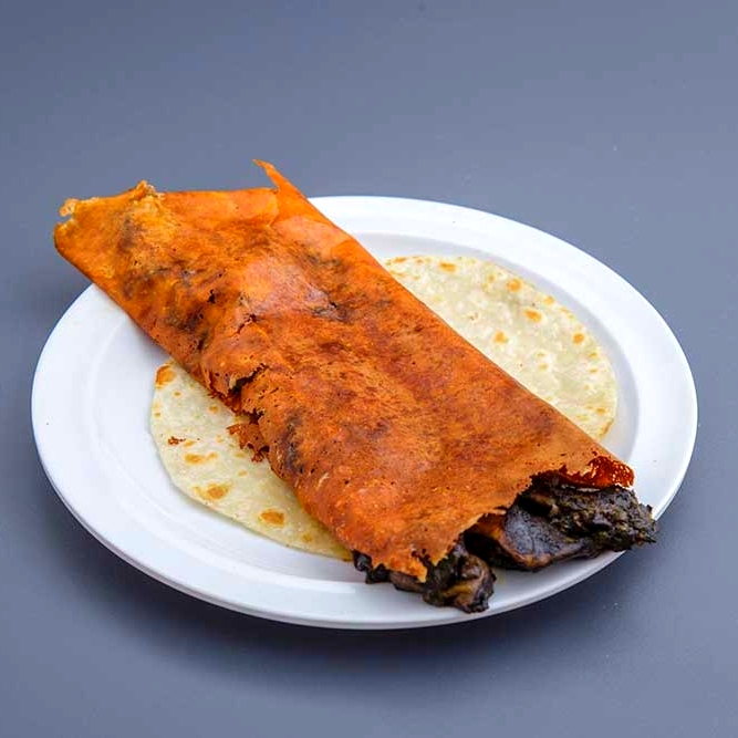 costra de queso con carne de suadero y tortilla de harina