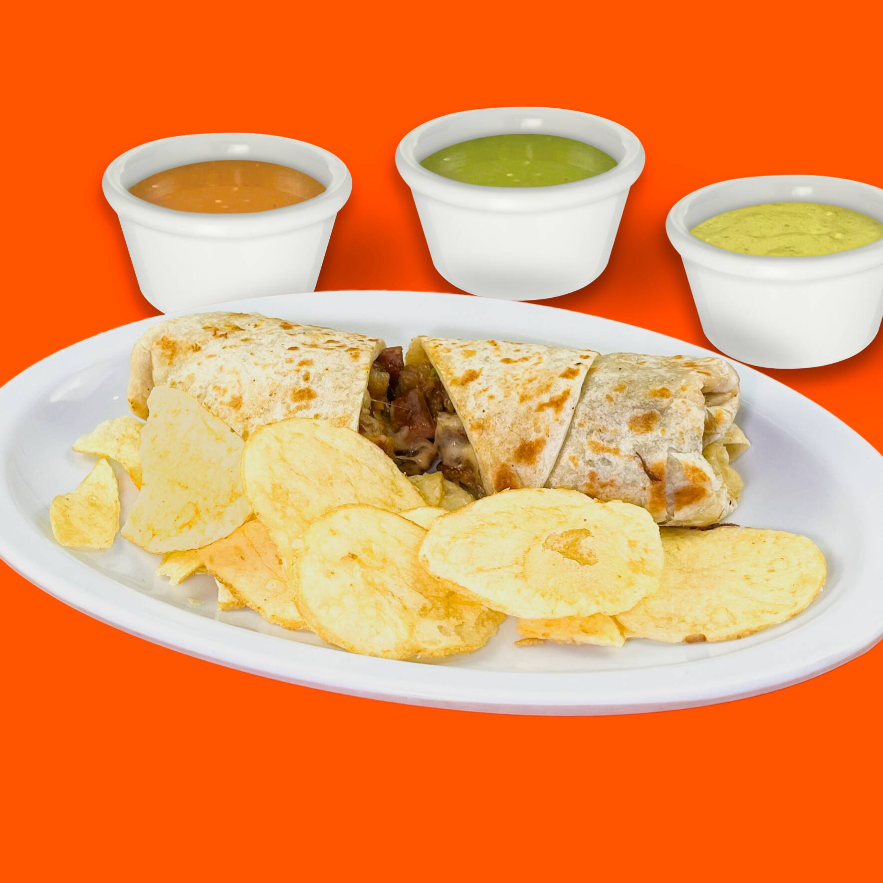 100 Gramos de carne, 60 gramos de queso manchego y tortillas de harina.