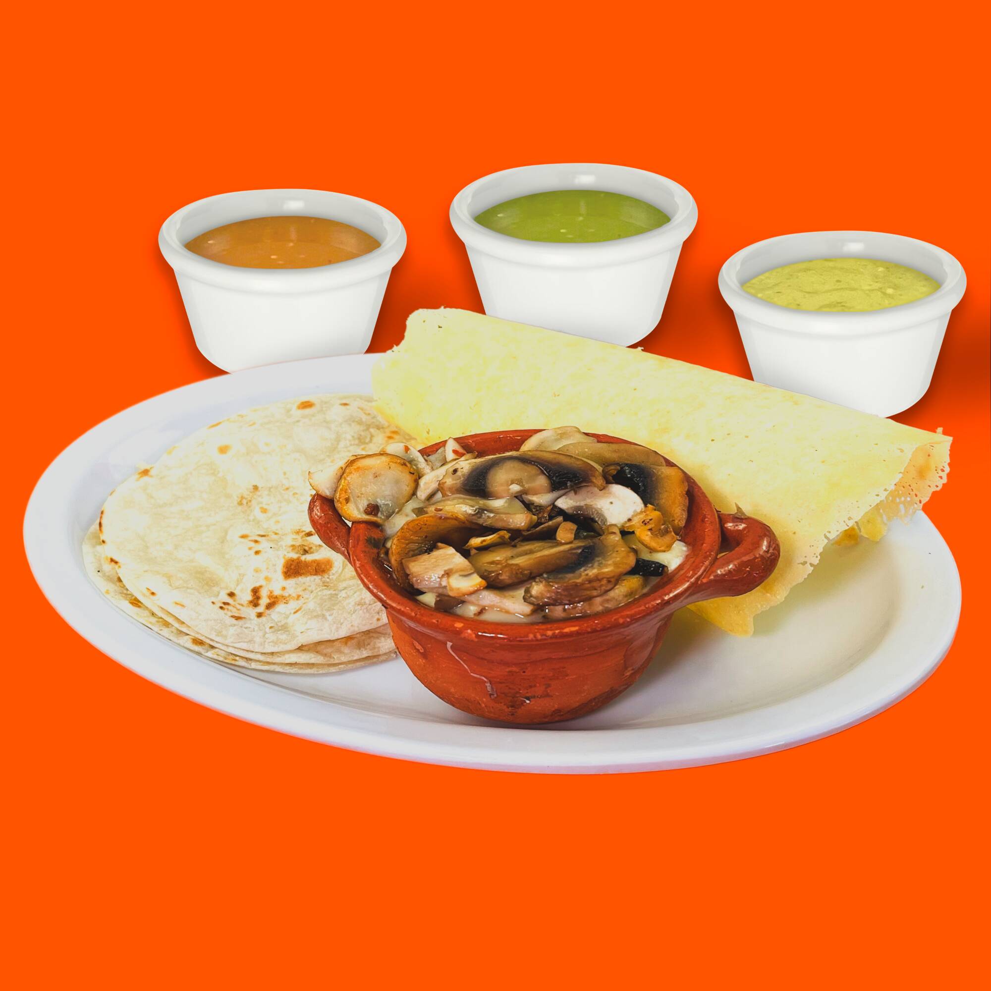 Queso fundido con champiñones se acompaña con tres tortillas de harina