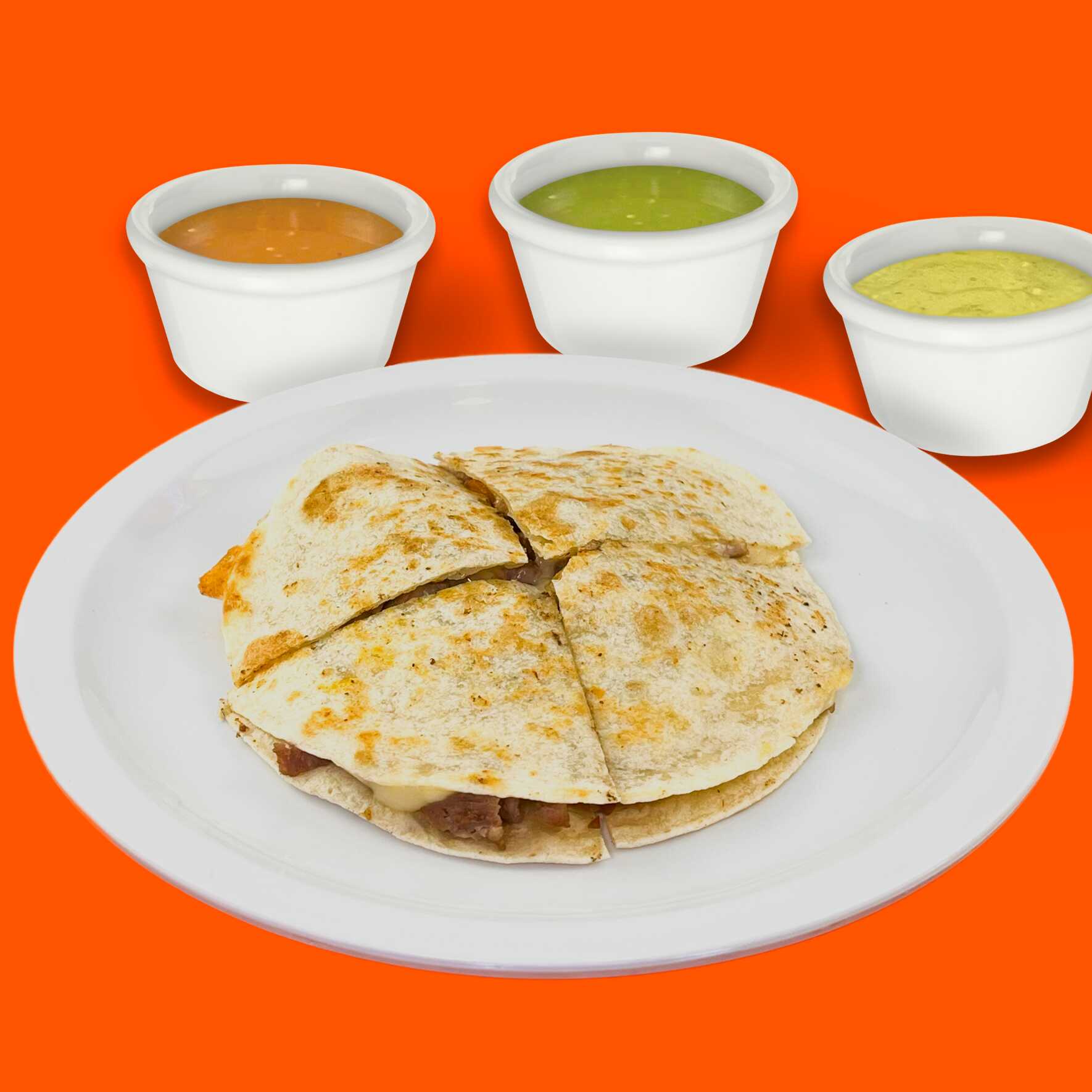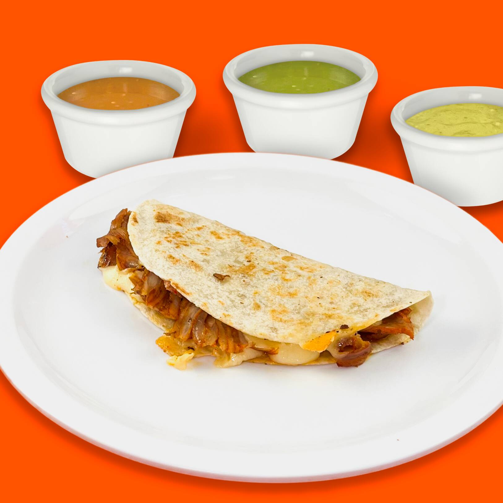 Quesadilla en tortilla de harina con pastor y queso gratinado