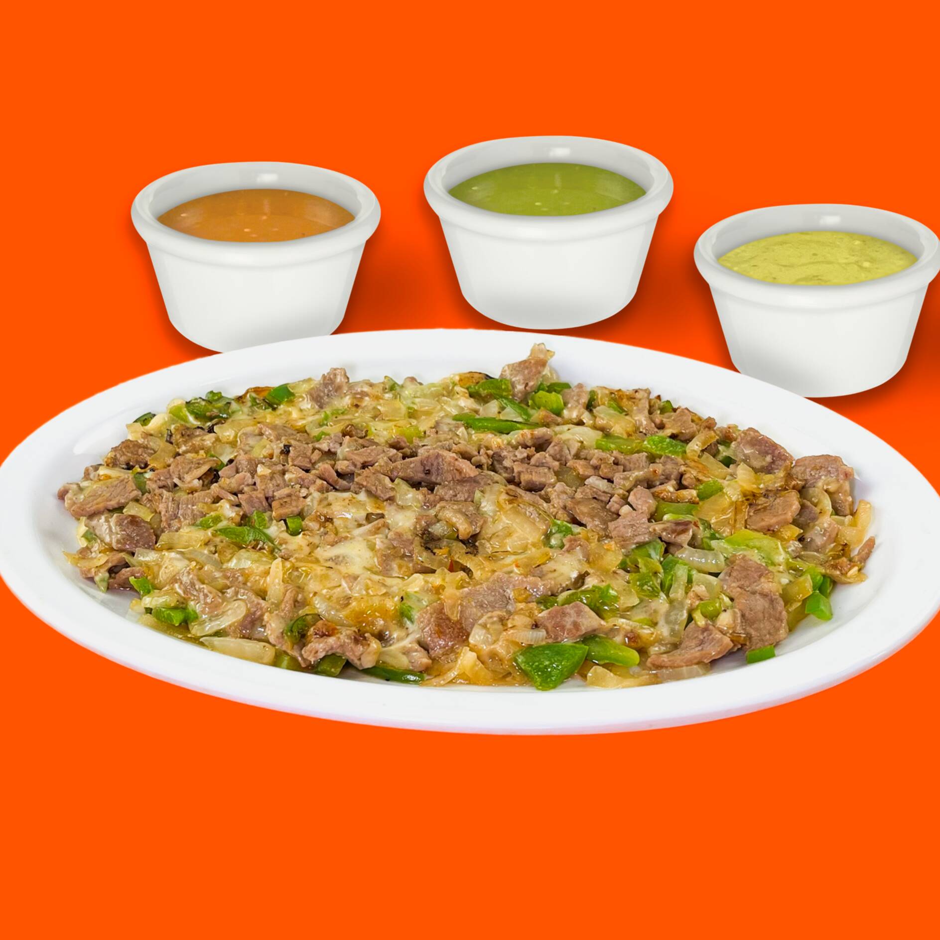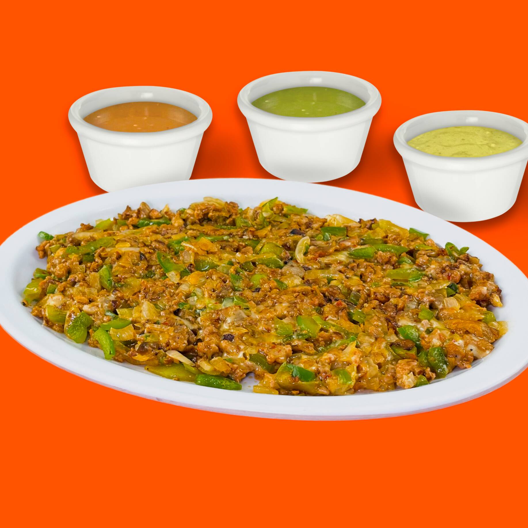 80 Gramos de carne, 60 gramos de queso manchego, base de frijoles, cebolla, cilantro y queso gratinado