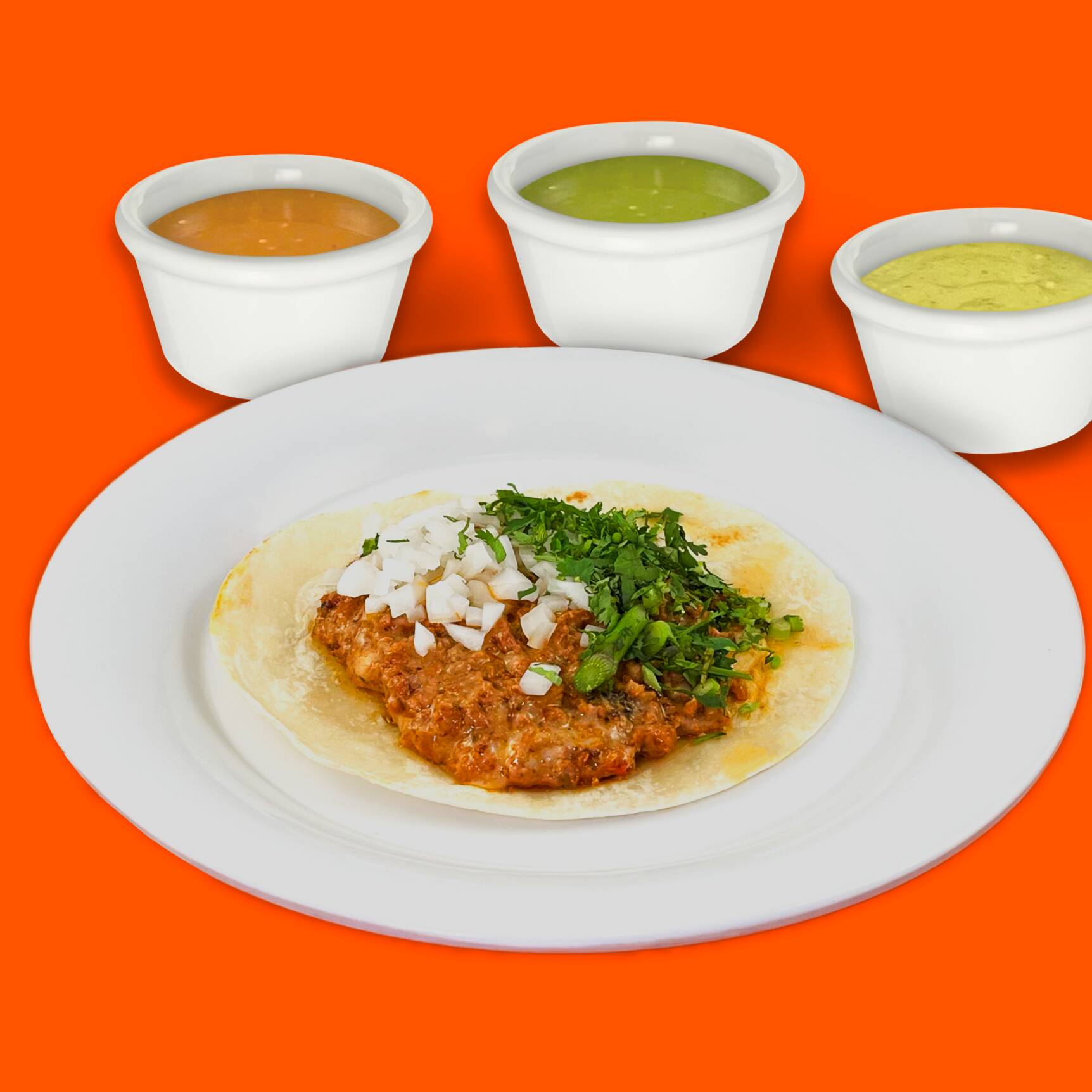 tostada con frijoles refritos de la casa, la carne de tu elección y queso gratinado