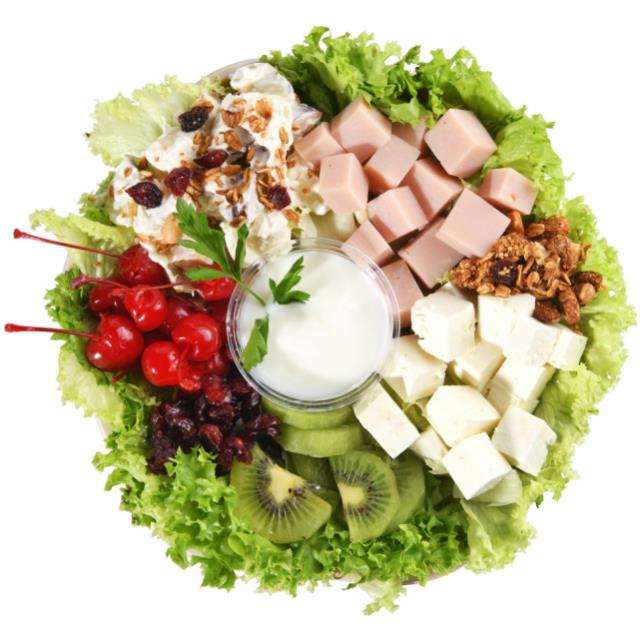 Ensalada de manzana, kiwi, cereza, yogurt natural, queso panela, pechuga de pavo, arándanos, granola.