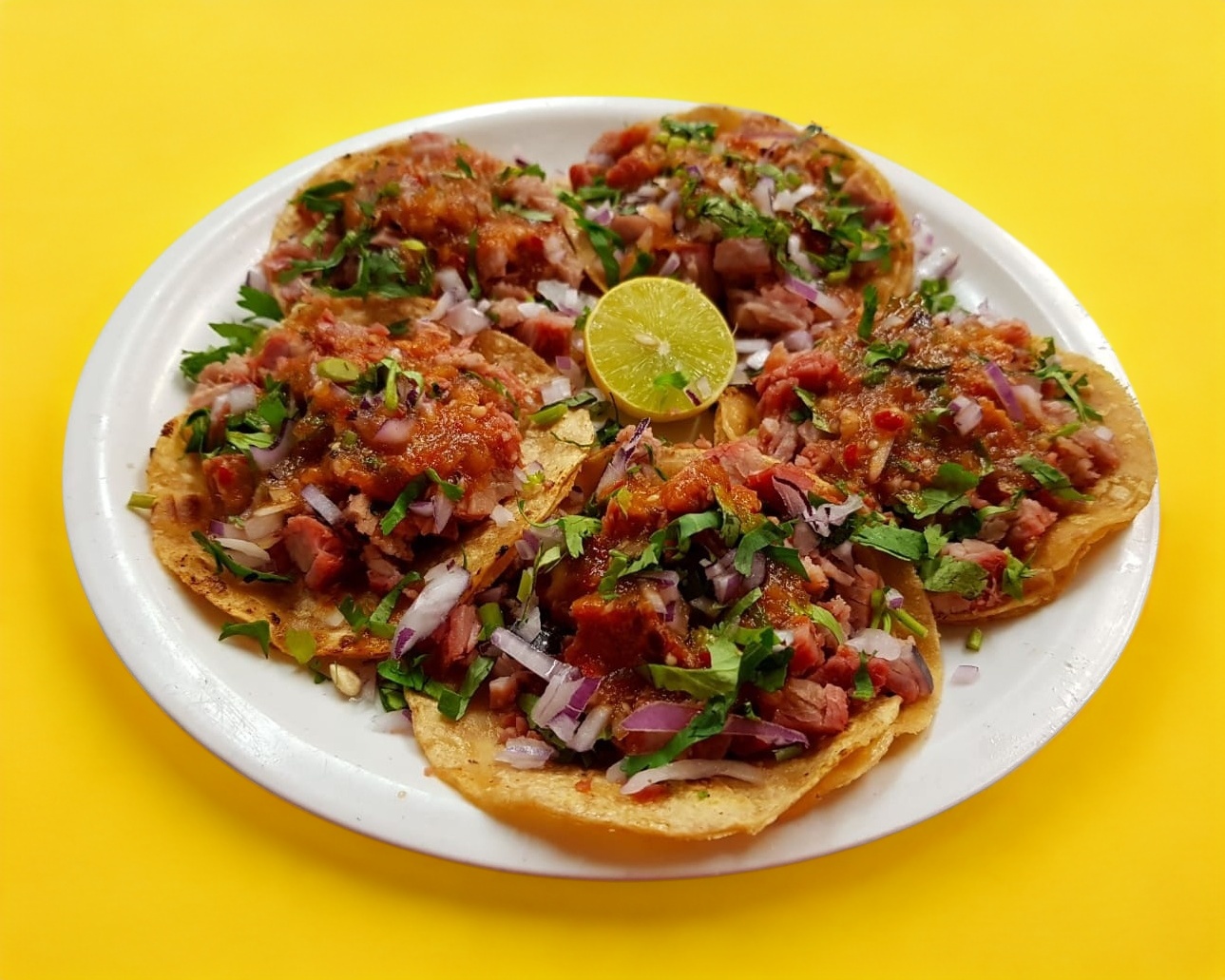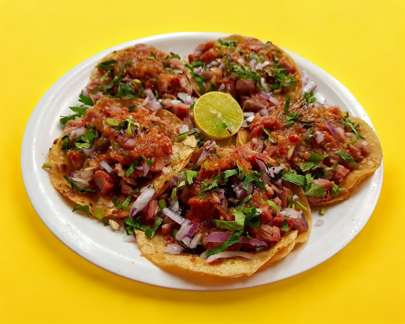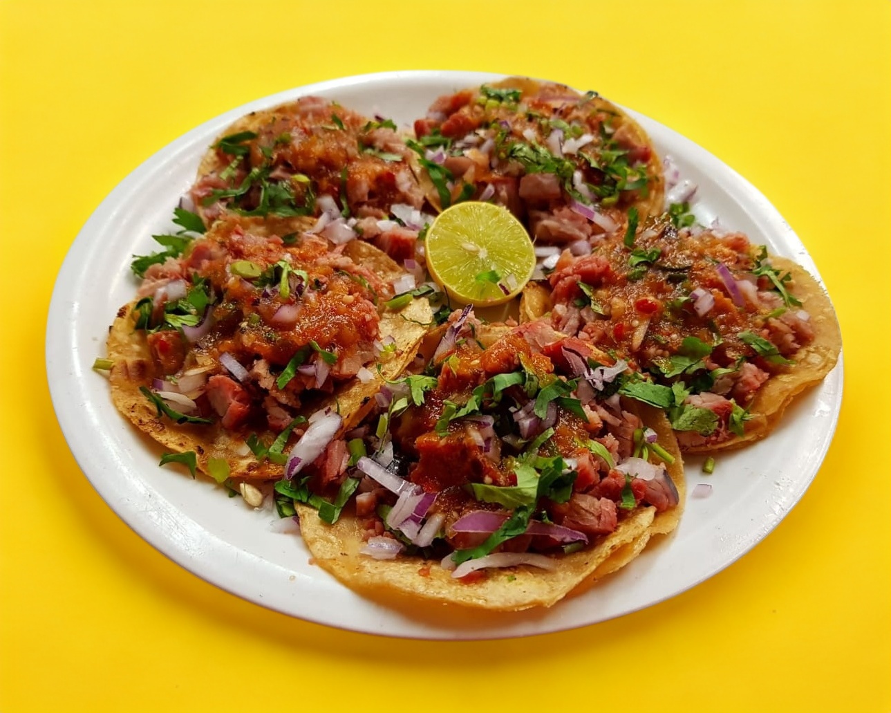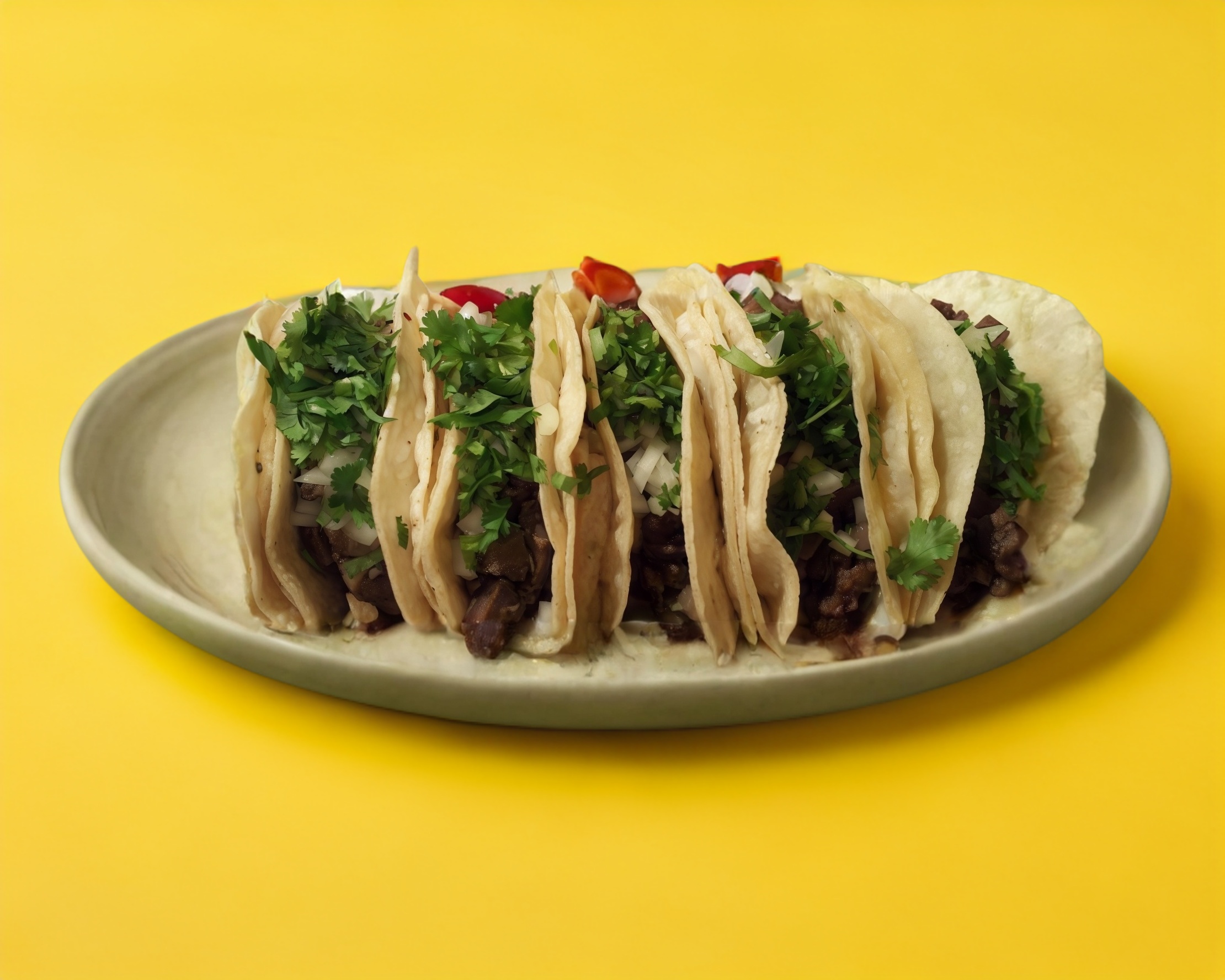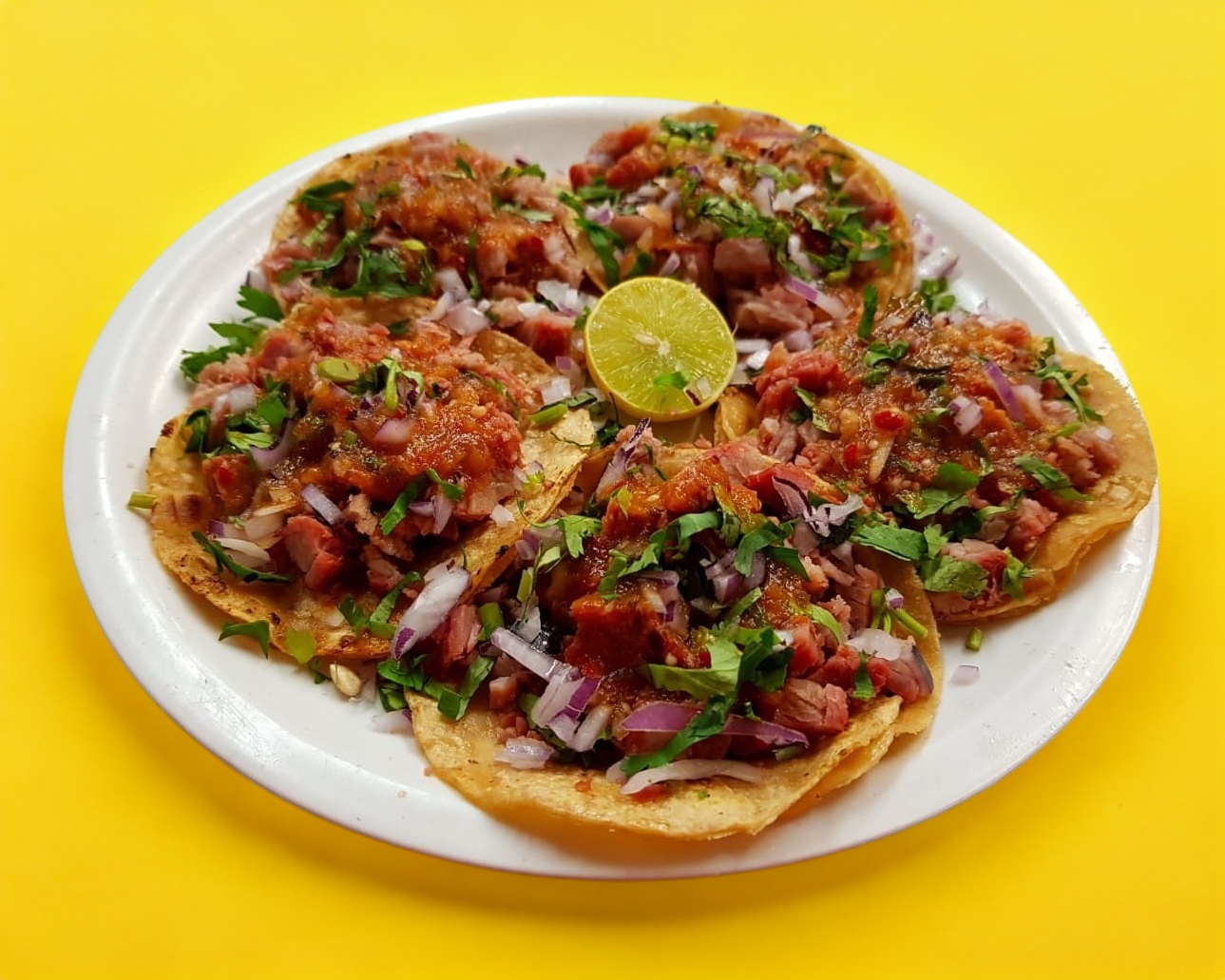 Porción personal: 2 tortillas de maíz taqueras con carne suadero verduras (Cilantro y cebolla que van por separado) y salsa 1pz.