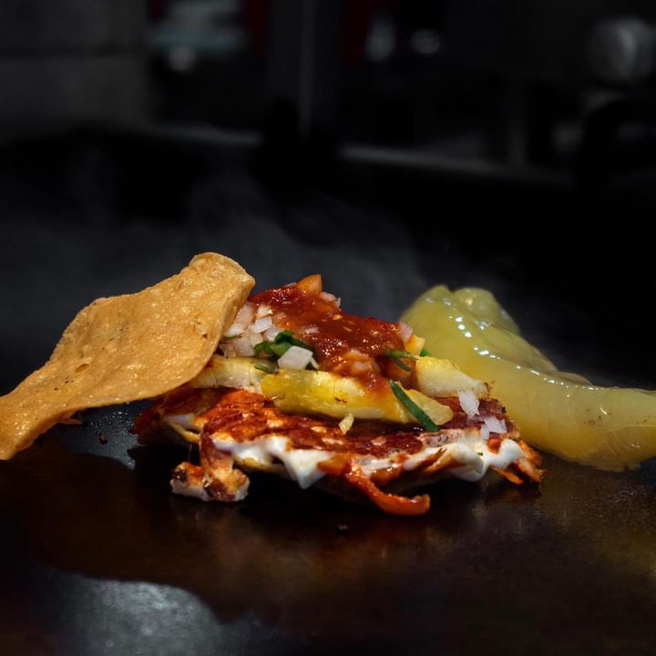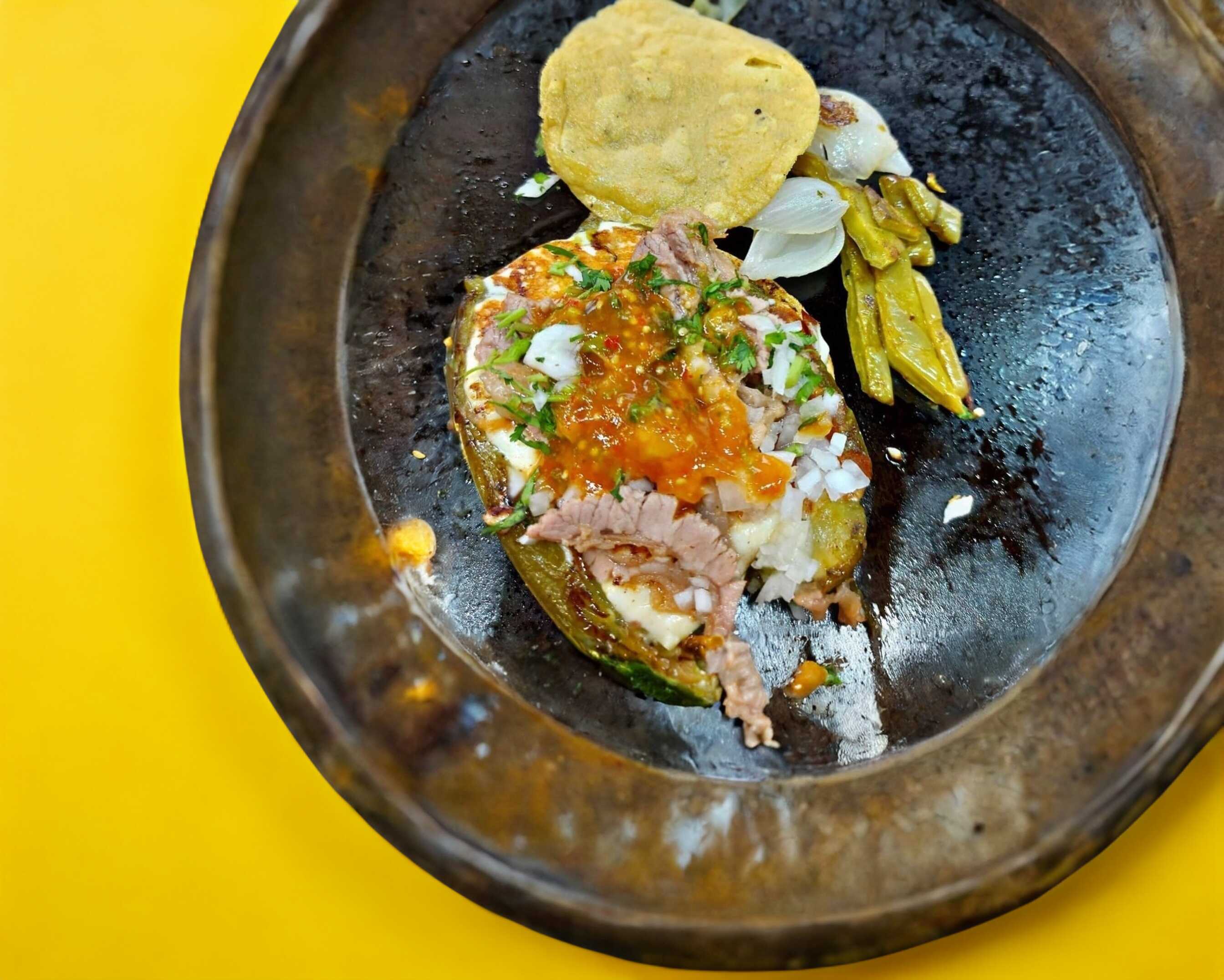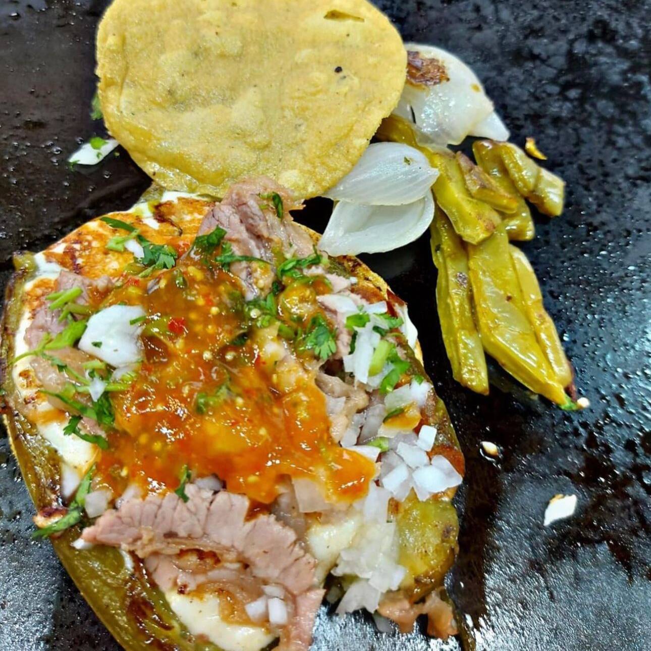 taco de chile cuaresmeño con suadero y tripa con queso gratinado
