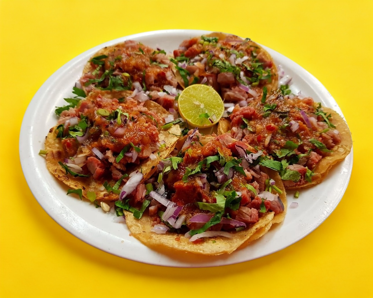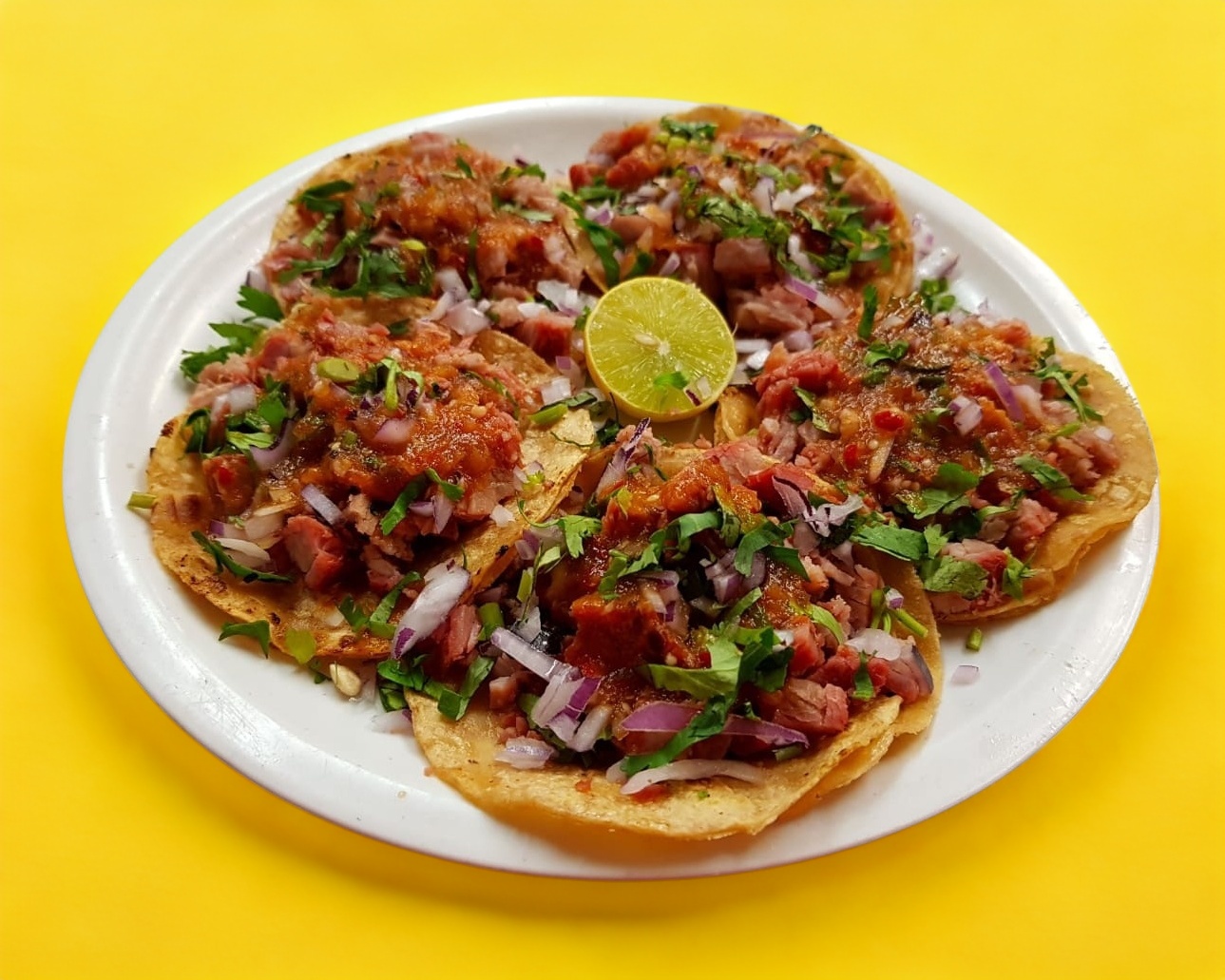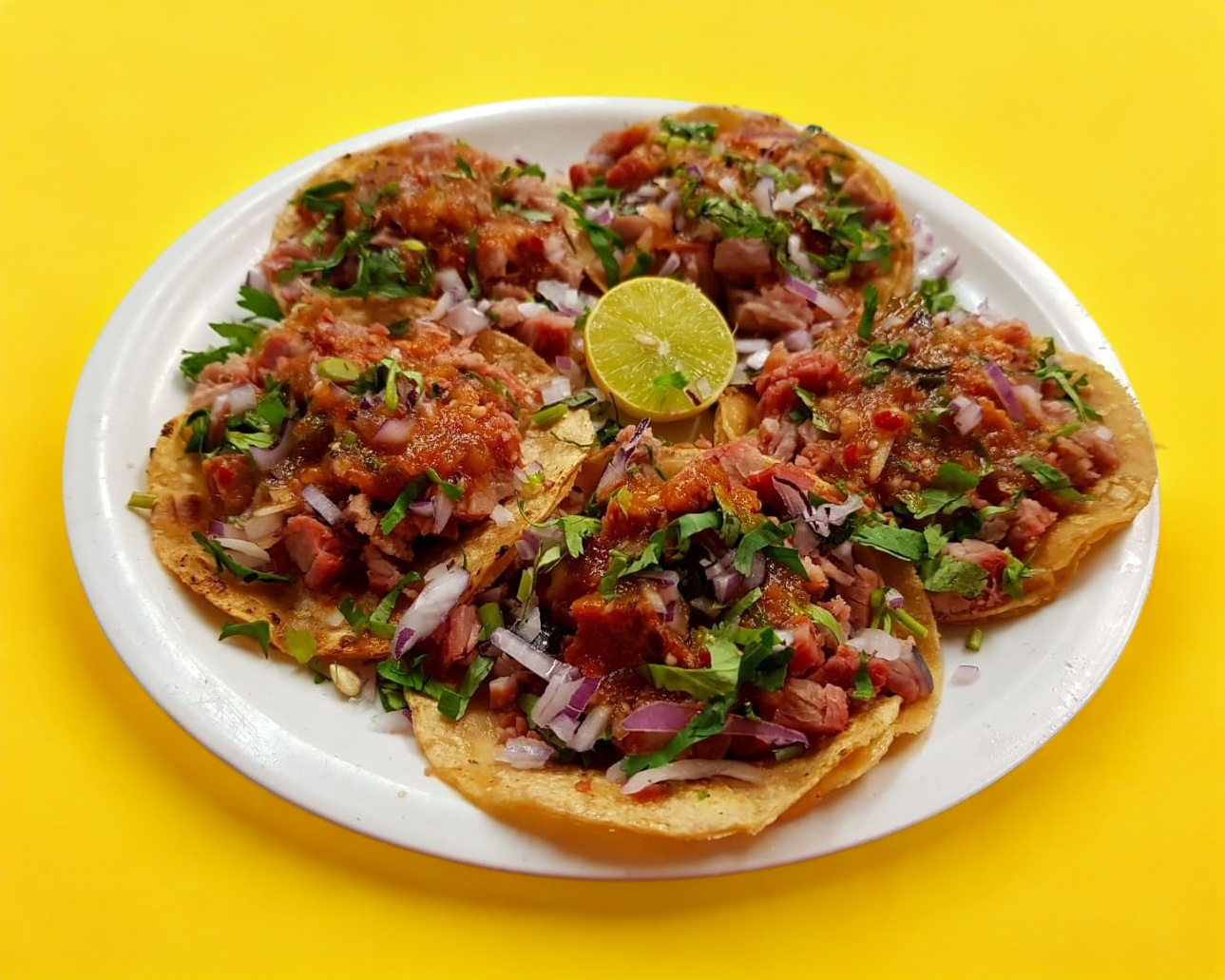cada taco 2 tortillas taqueras con carne suadero verduras y salsa