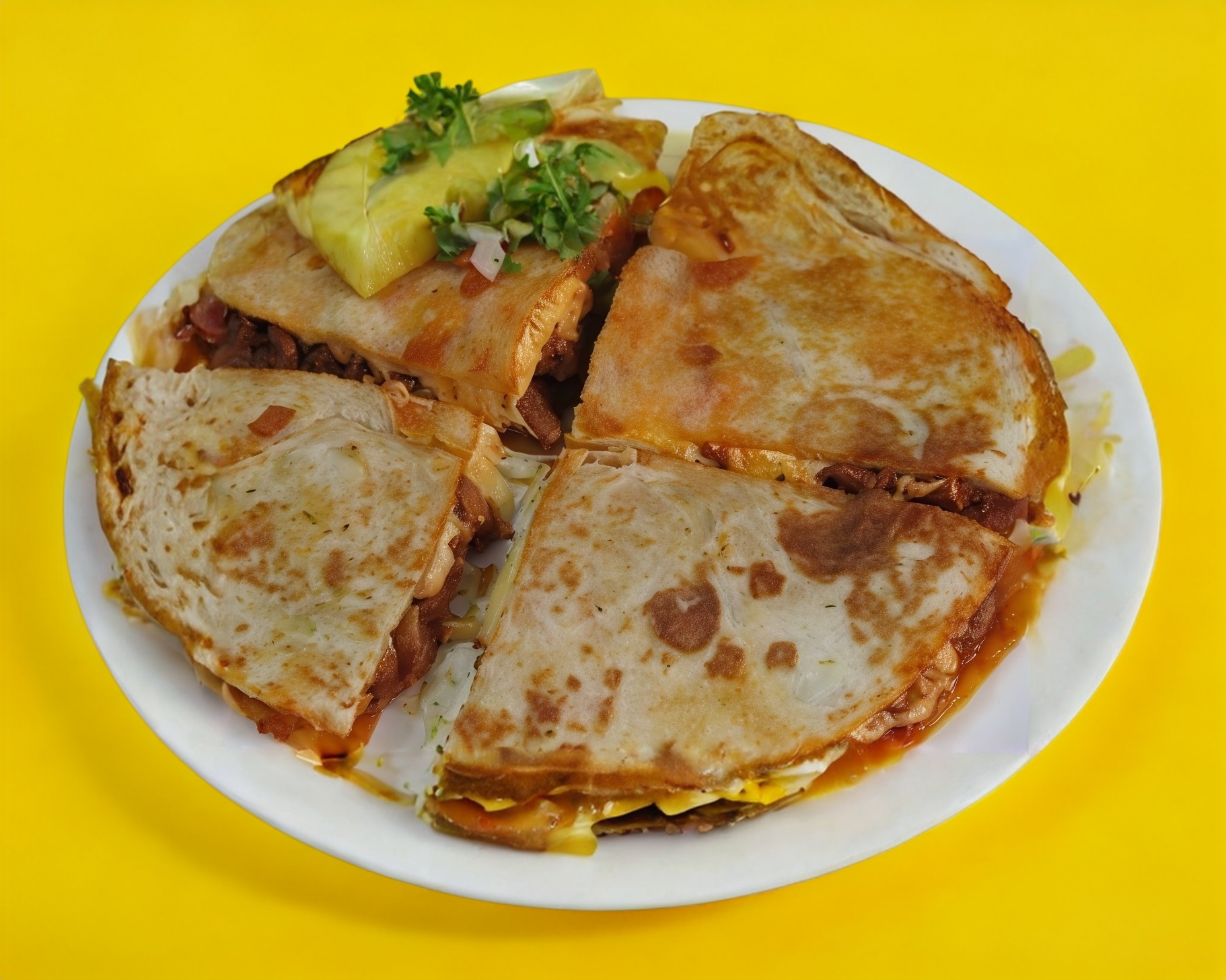 Porción personal: 2 tortillas de harina con suadero con queso verduras y salsa