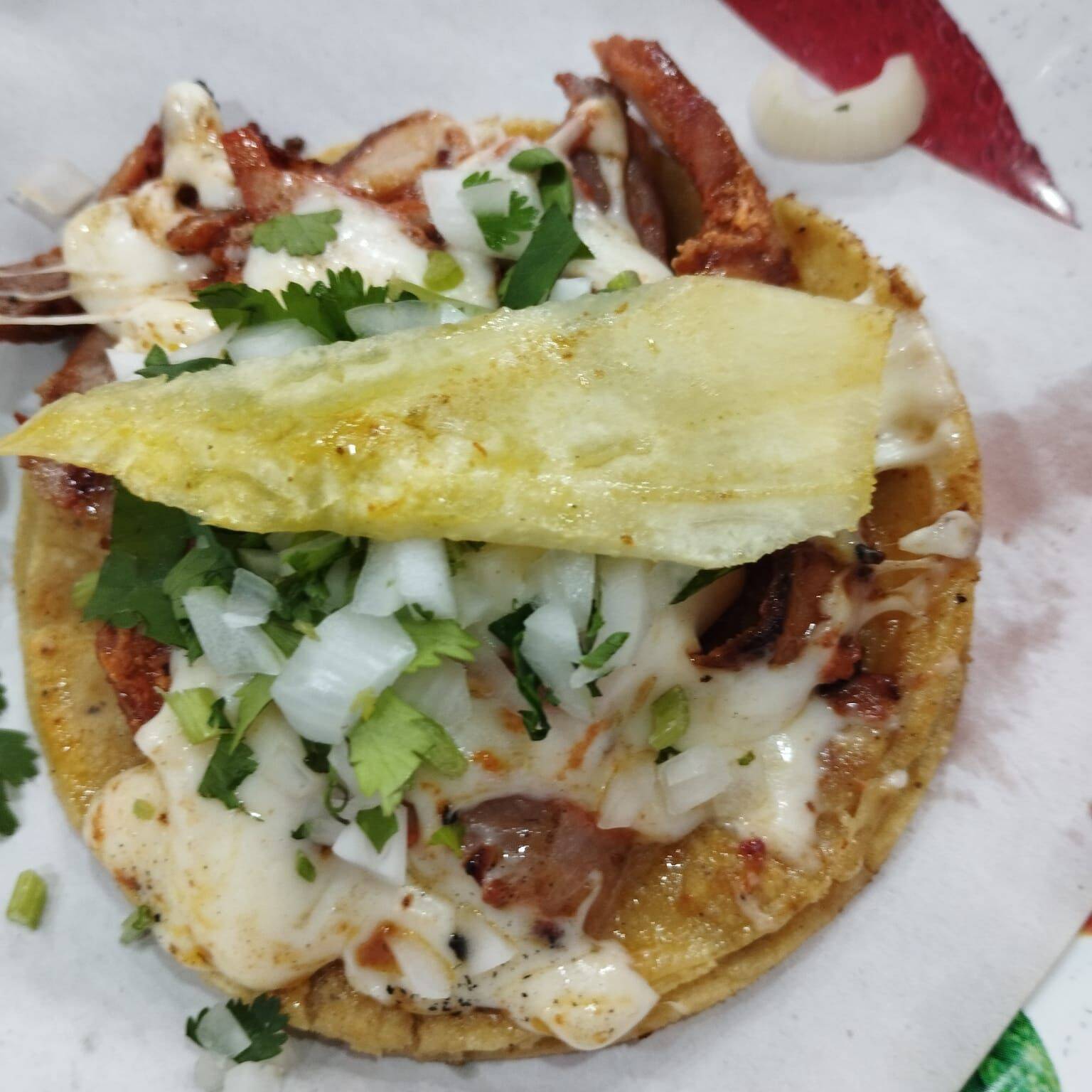 2 tortillas taqueras de maiz con carne al pastor con queso verduras y salsa