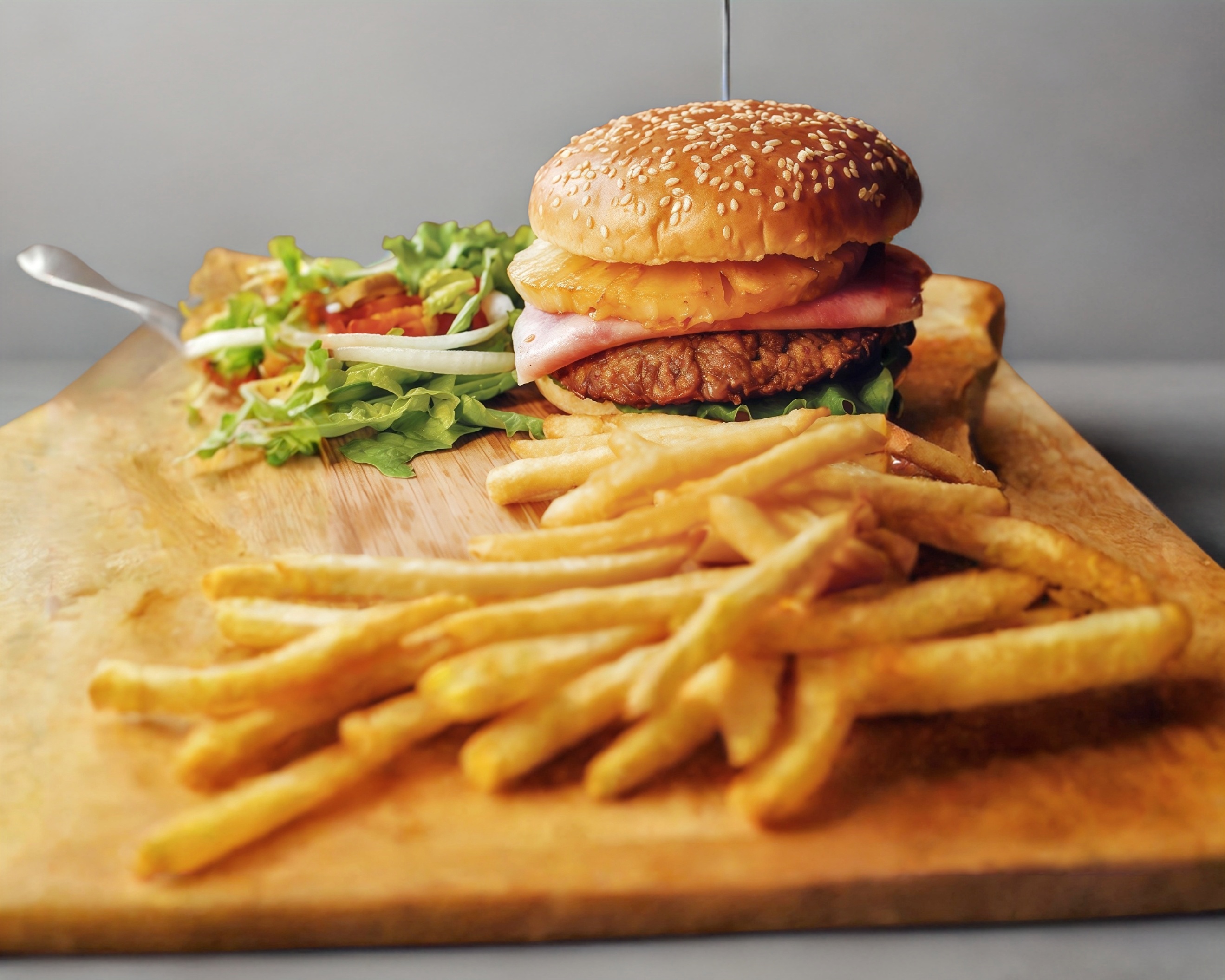Hamburguesa hawaiana con carne de res, jamón, piña, quesillo y queso amarillo. Incluye papas y refresco. Hamburguesa incluye jitomate, aguacate, cátsup, mostaza y picante papas y refresco de 250 ml.