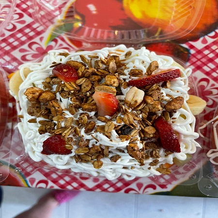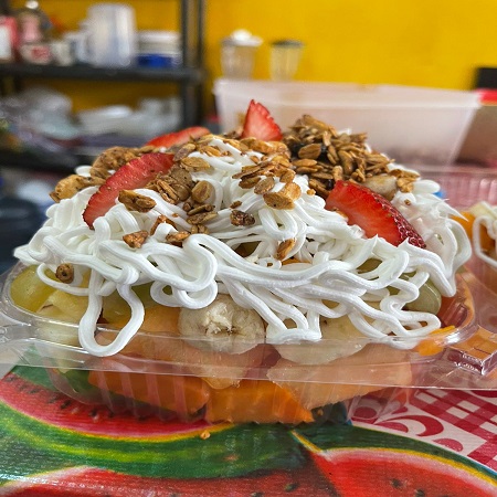 Coctel de frutas de 400 g el cual incluye un mix de frutas de temporada: papaya (1 rebanada), melón (1 rebanada), sandía (1 rebanada), plátano, manzana con chantillí y granola.