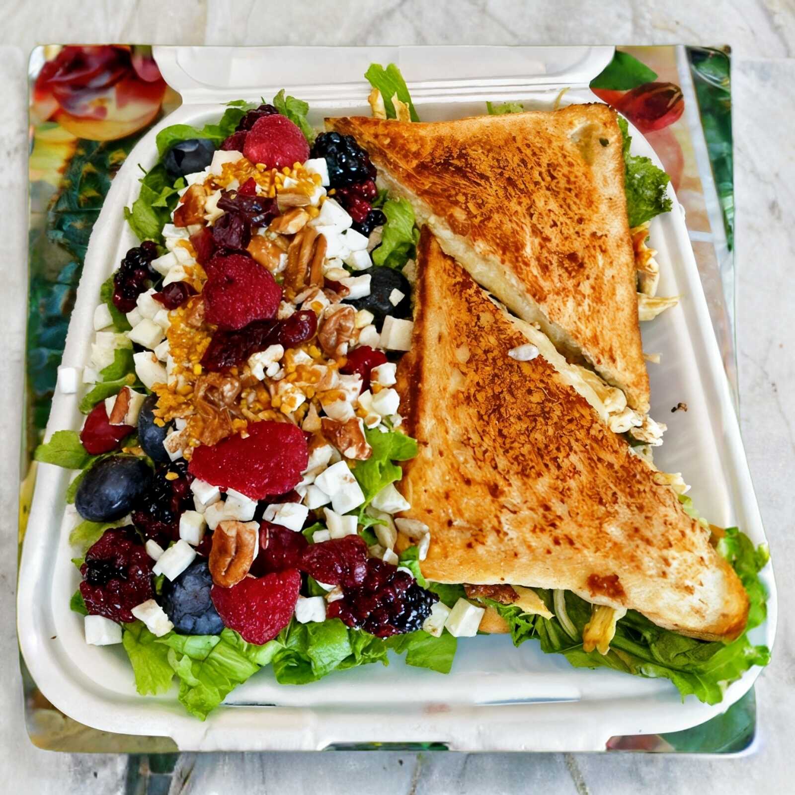 Sándwich (pan blanco con jamón, queso manchego, jamón, aderezo, jitomate, aguacate y rajas) y ensalada de tu elección.(Porcion personal)