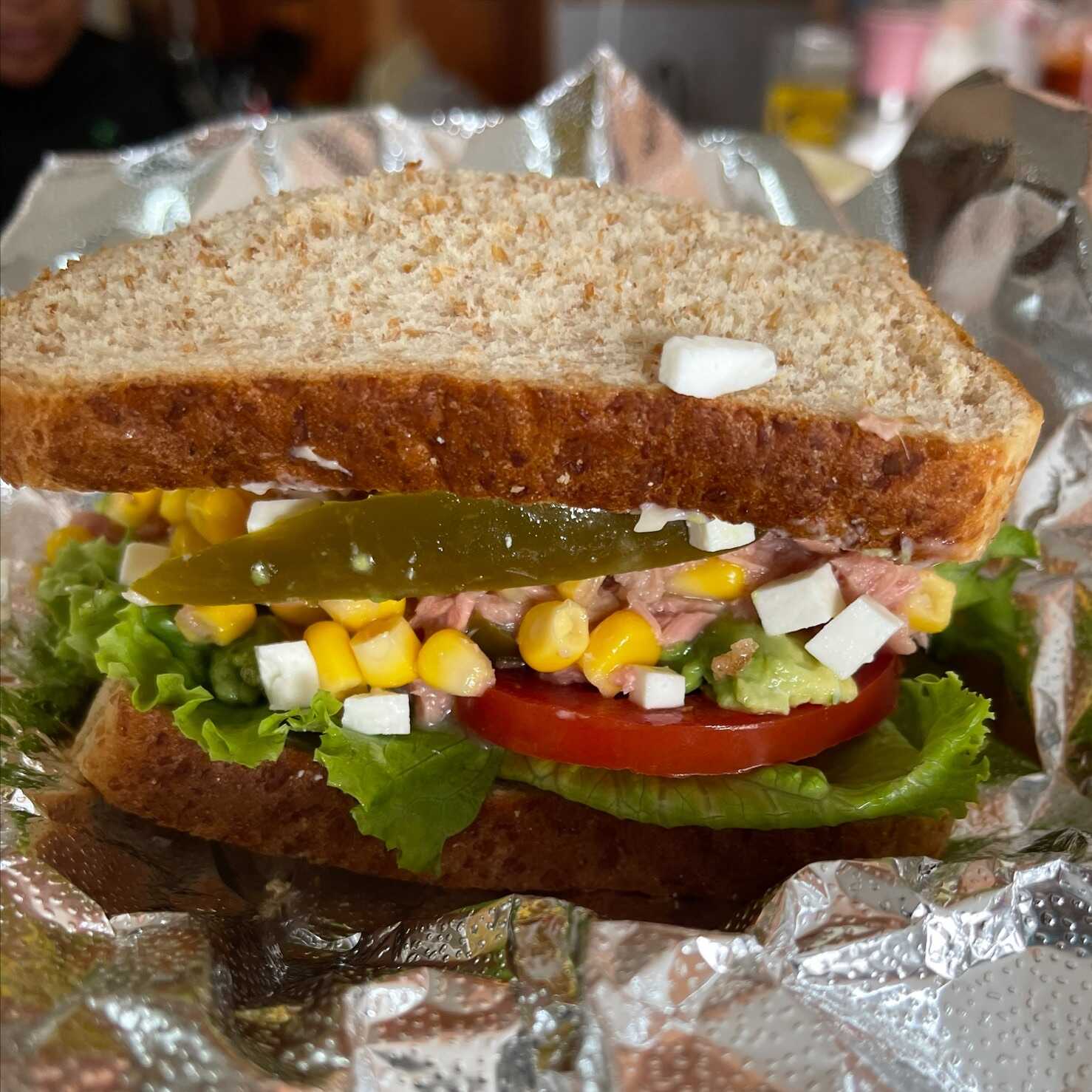 un delicioso y fresco enpadredado de atun con lechuga jitomate aguacate y rajas