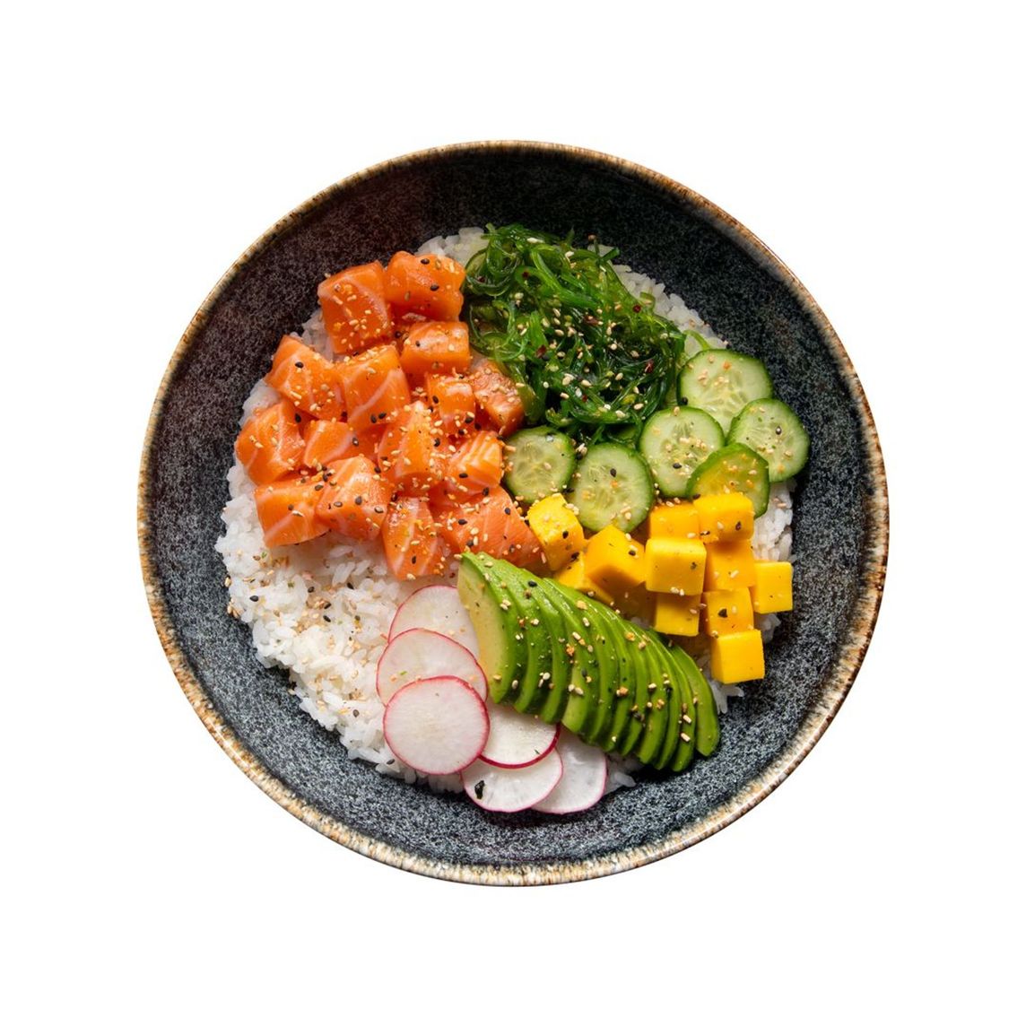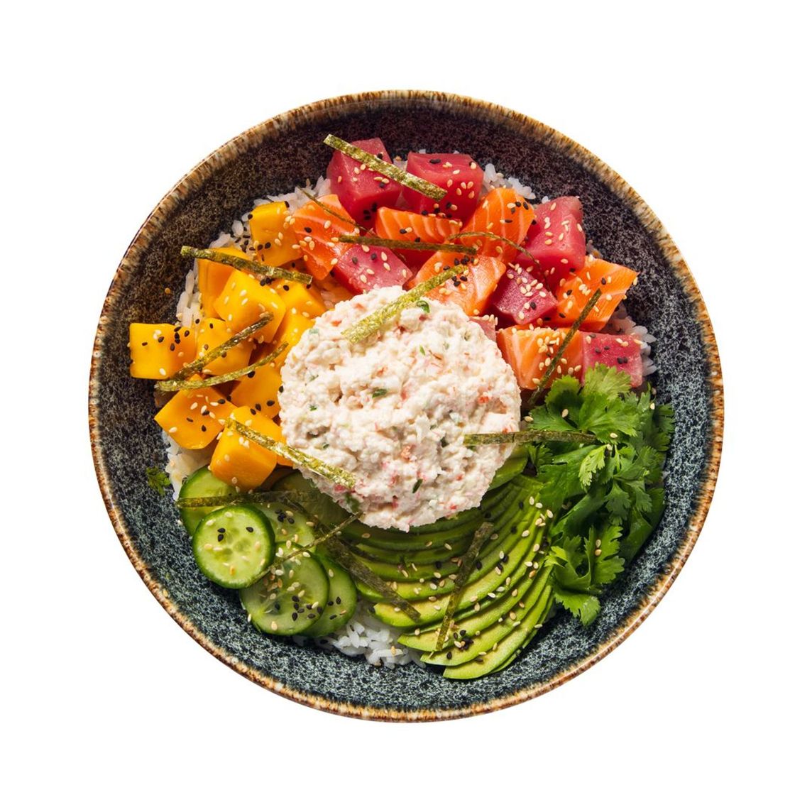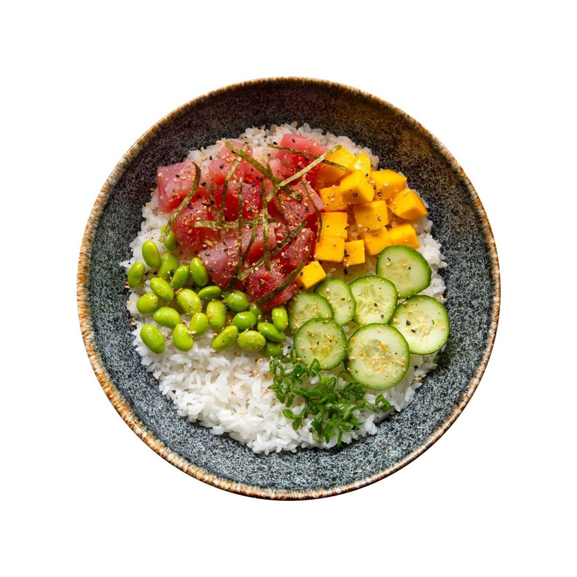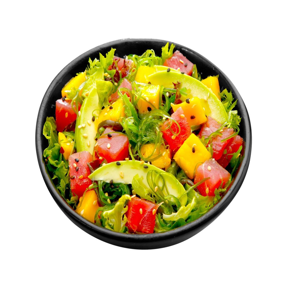 Atún (60 g), mango, seaweed, aguacate, lechugas, ajonjolí mixto y salsa de gyozas.