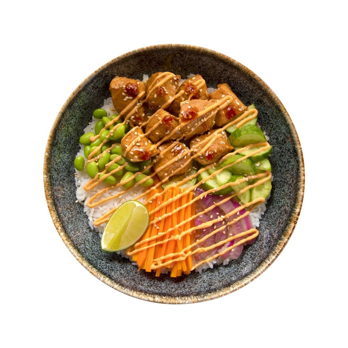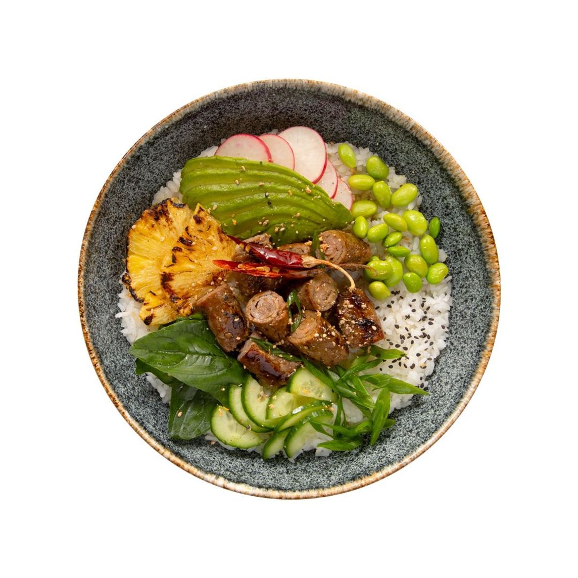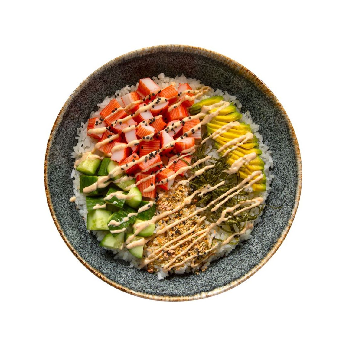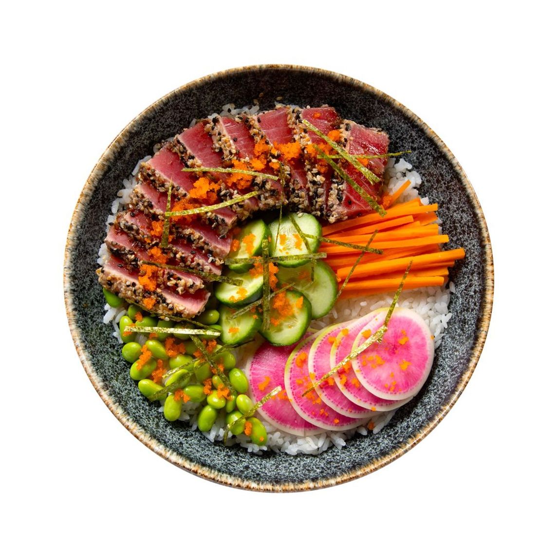 Atún (60 g), mango, seaweed, aguacate, lechugas, ajonjolí mixto y salsa de gyozas.