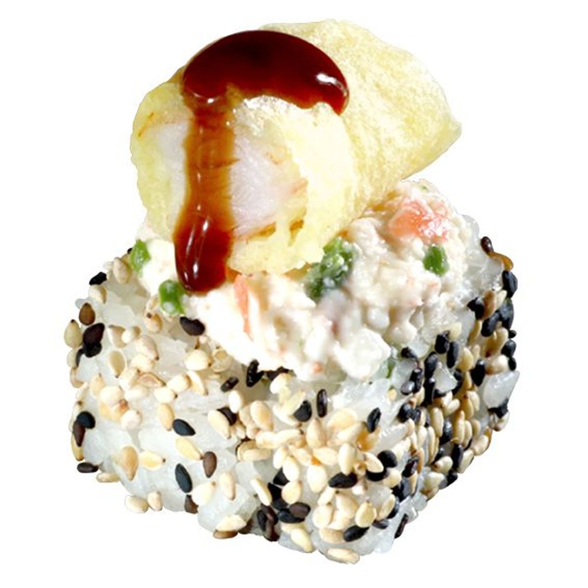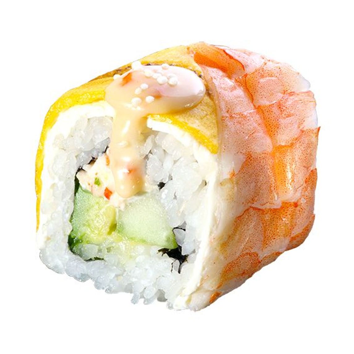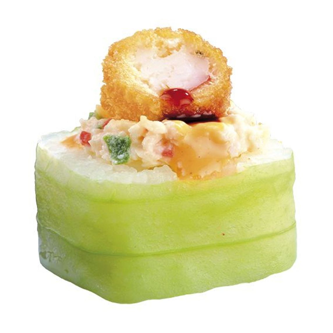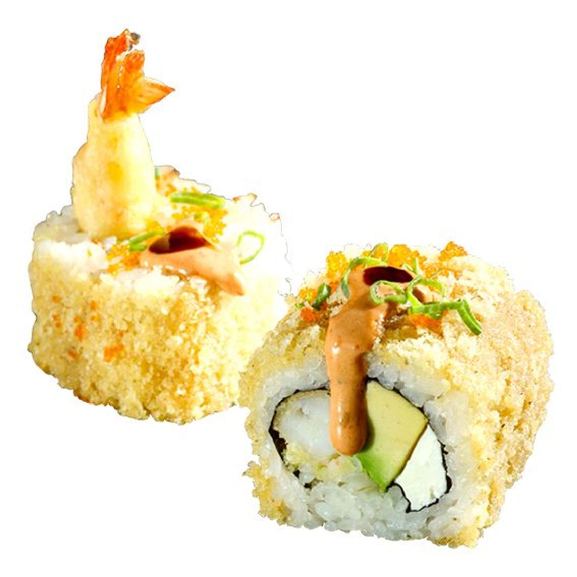 10 pzas. Topping: Pepino, tampico, camarón empanizado, tom-yum mayo y salsa de anguila. Por dentro: Cangrejo, aguacate y queso.