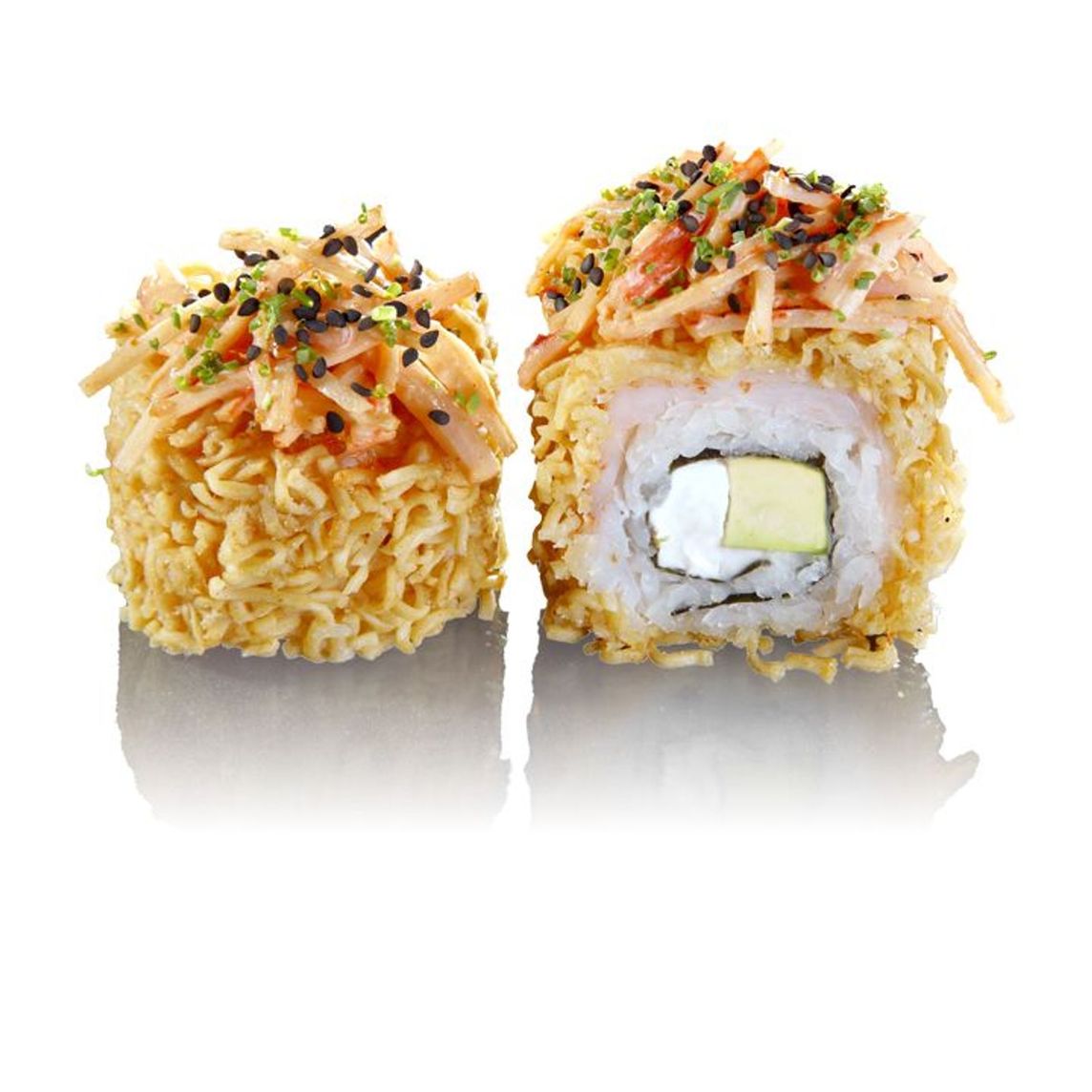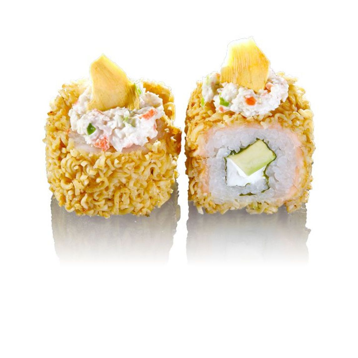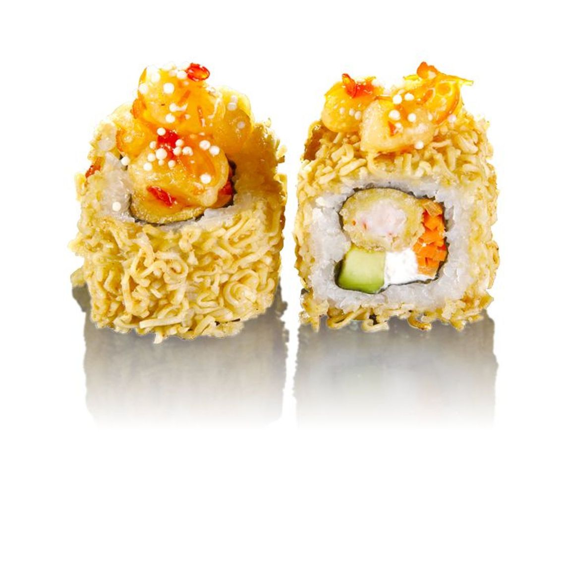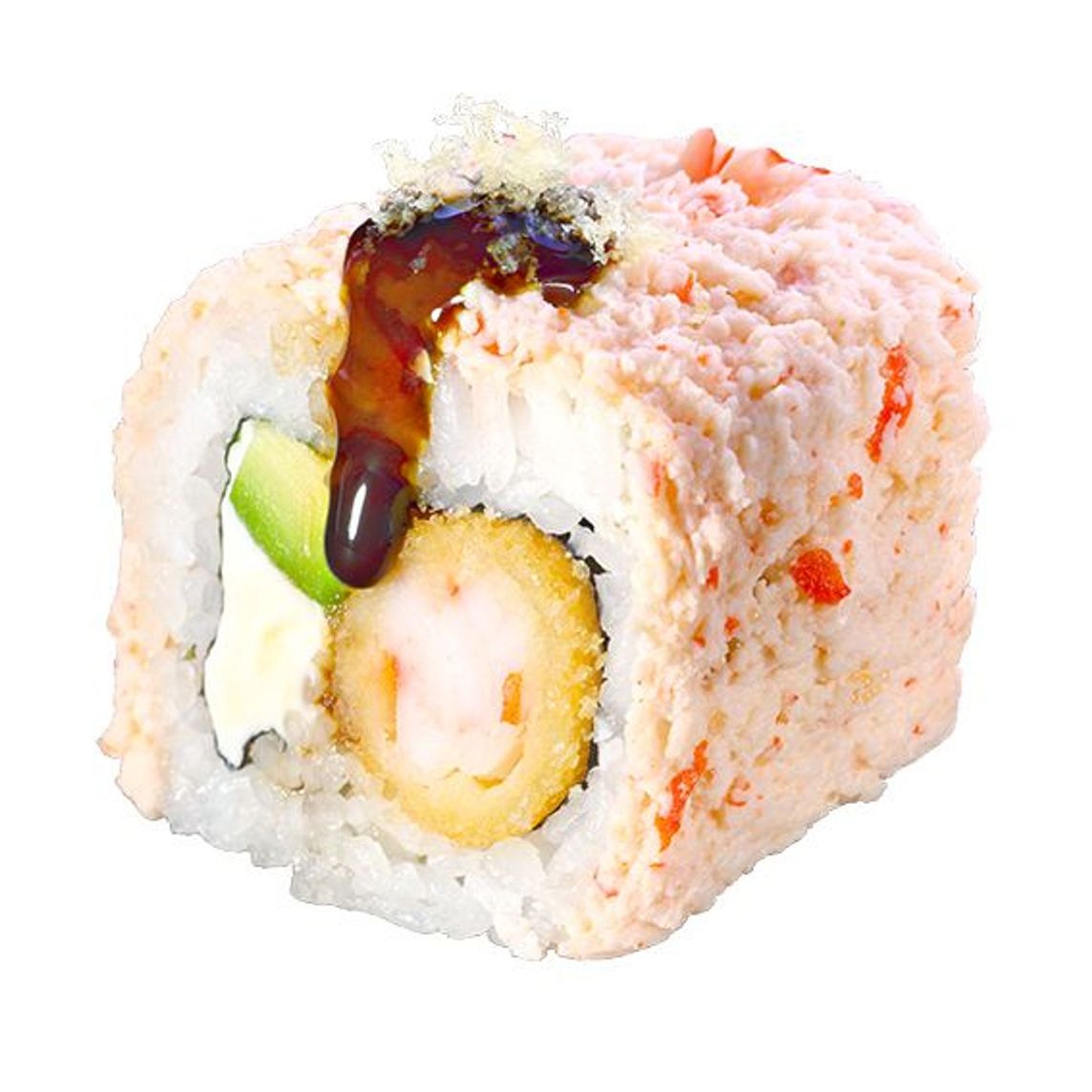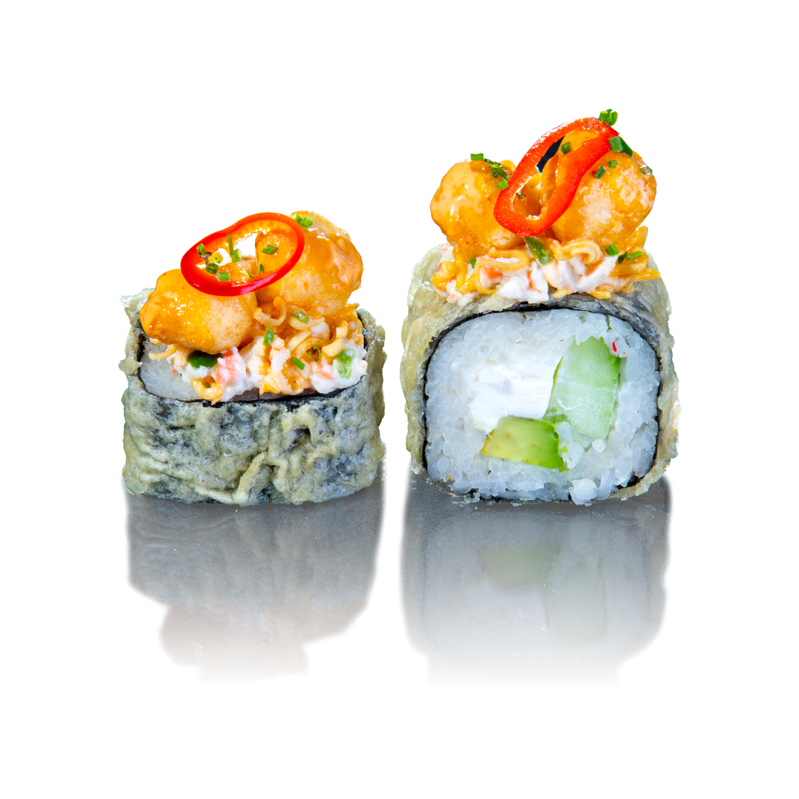10 pzas. Topping: Pepino, tampico, camarón empanizado, tom-yum mayo y salsa de anguila. Por dentro: Cangrejo, aguacate y queso.