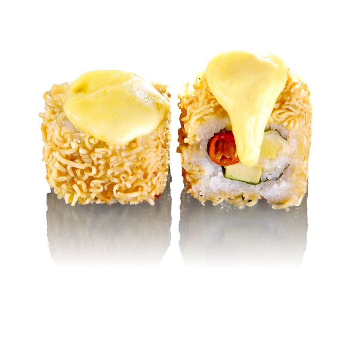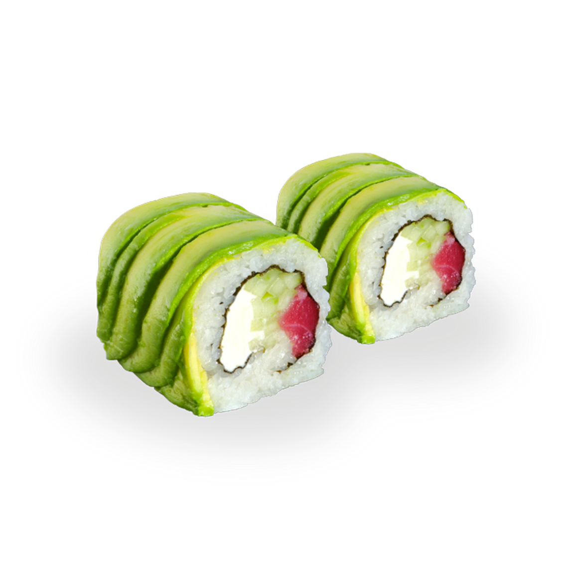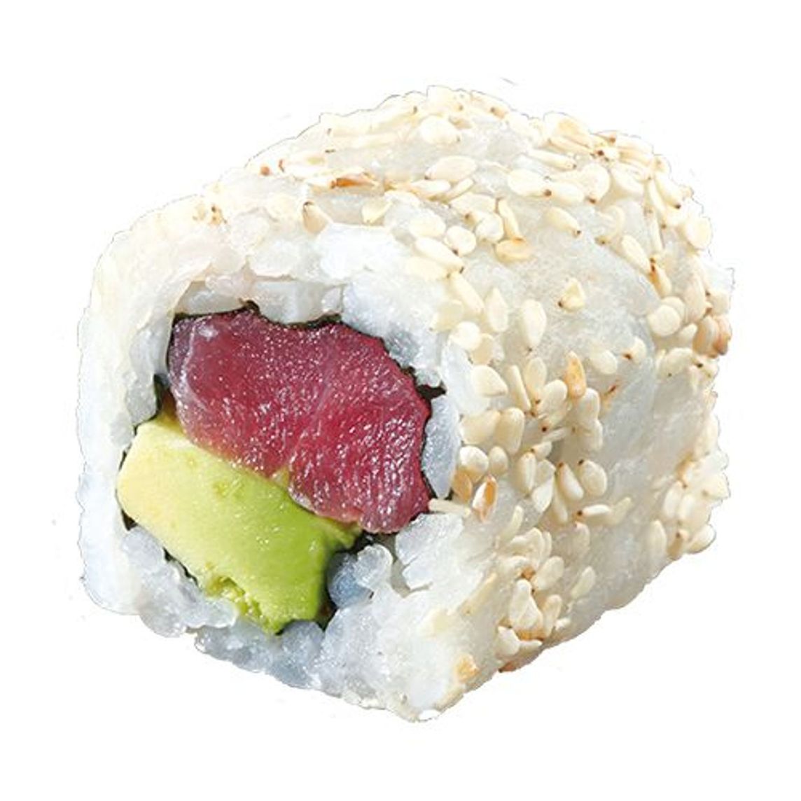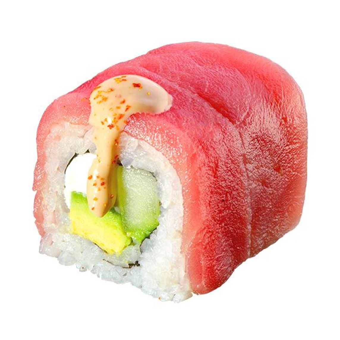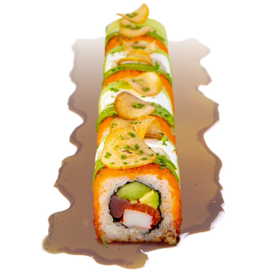 10 pzas. Topping: Atún y yuzu mayo. Por dentro: Aguacate, pepino y queso.