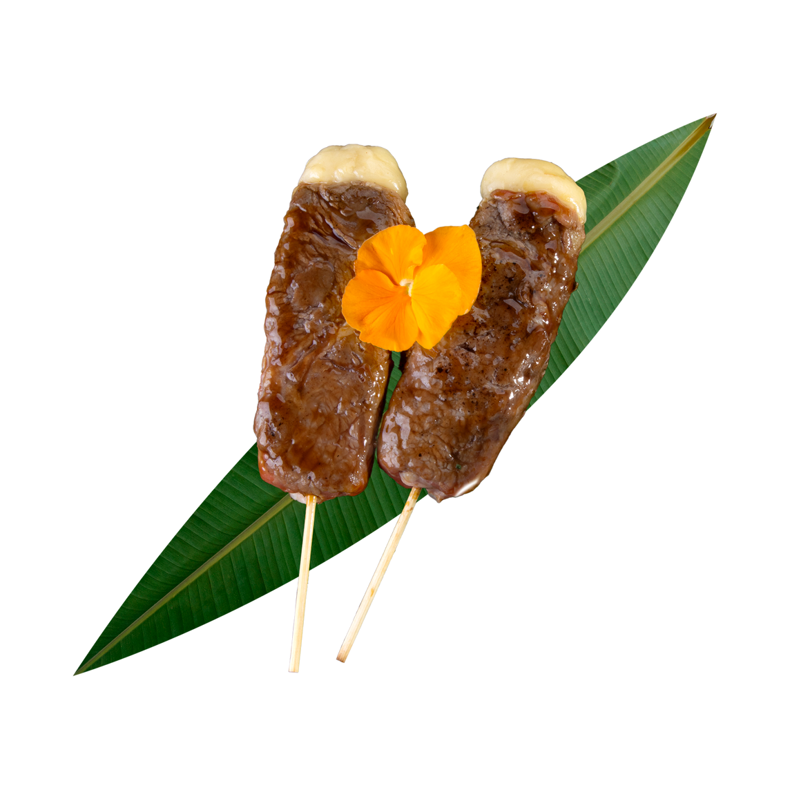 Brocheta a la parrilla con queso manchego envuelto de rib eye (60g) y salsa yakitori.