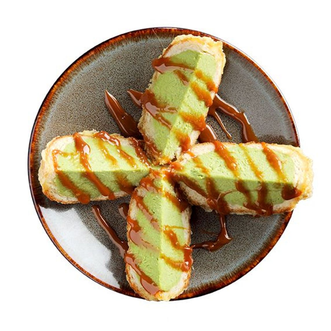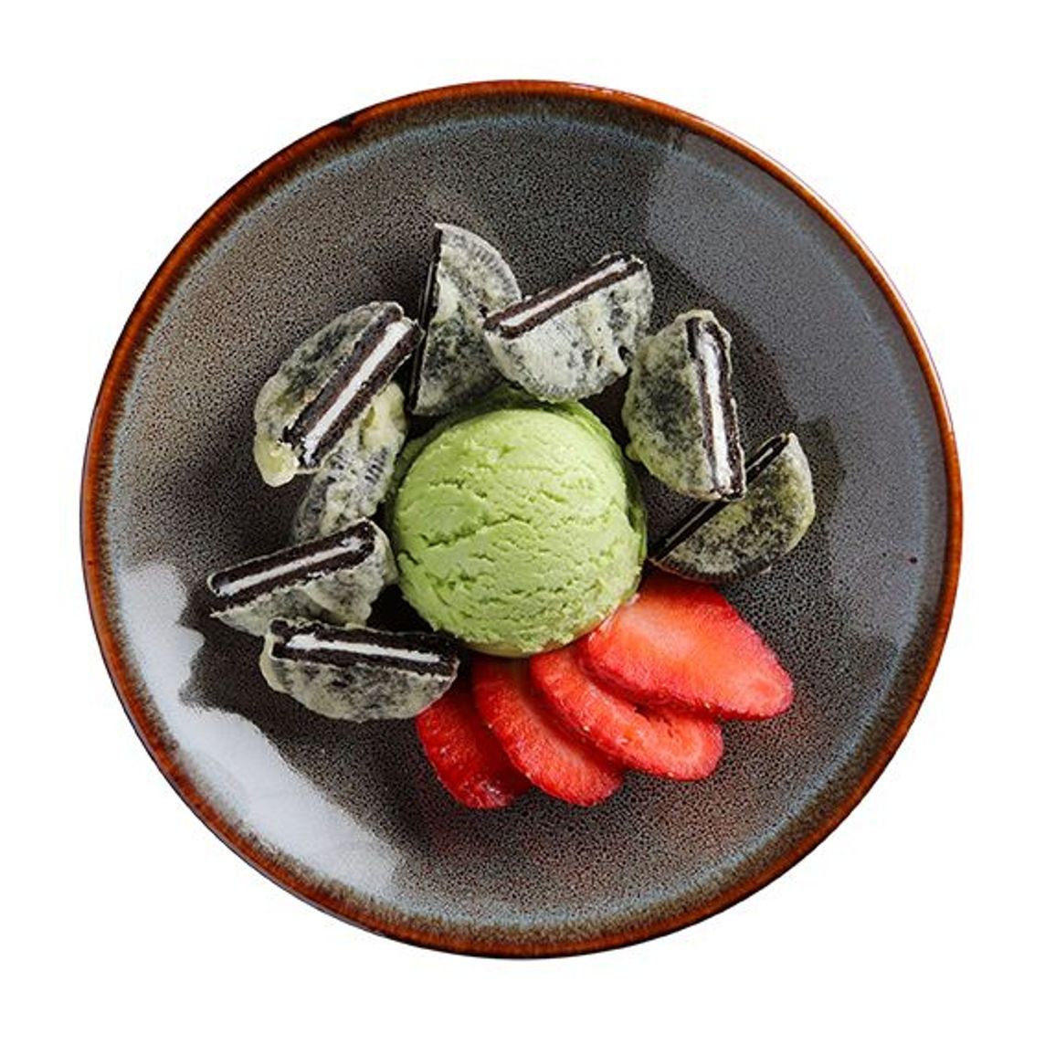 5 pzas. Galletas oreo tempuradas, helado de matcha y fresas.