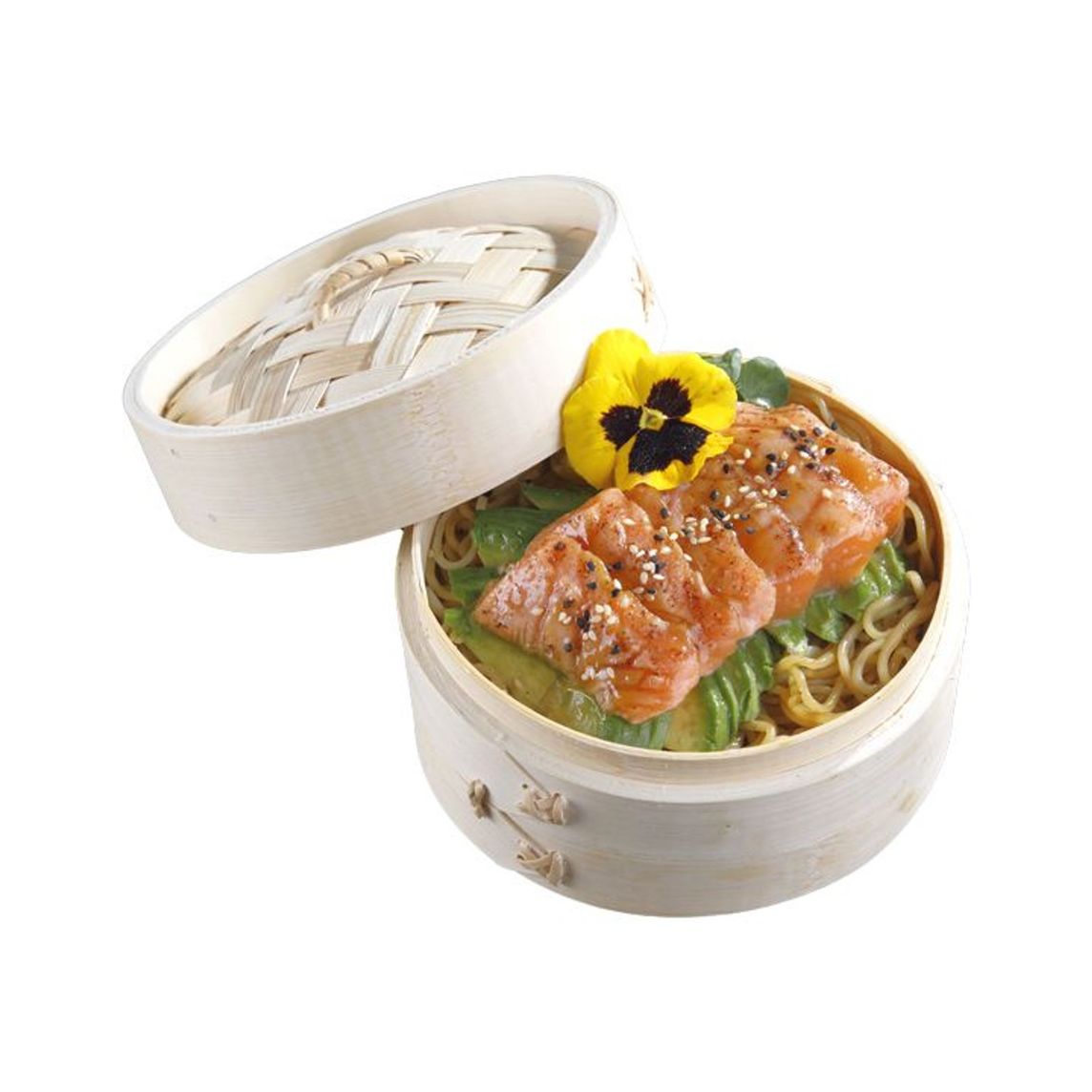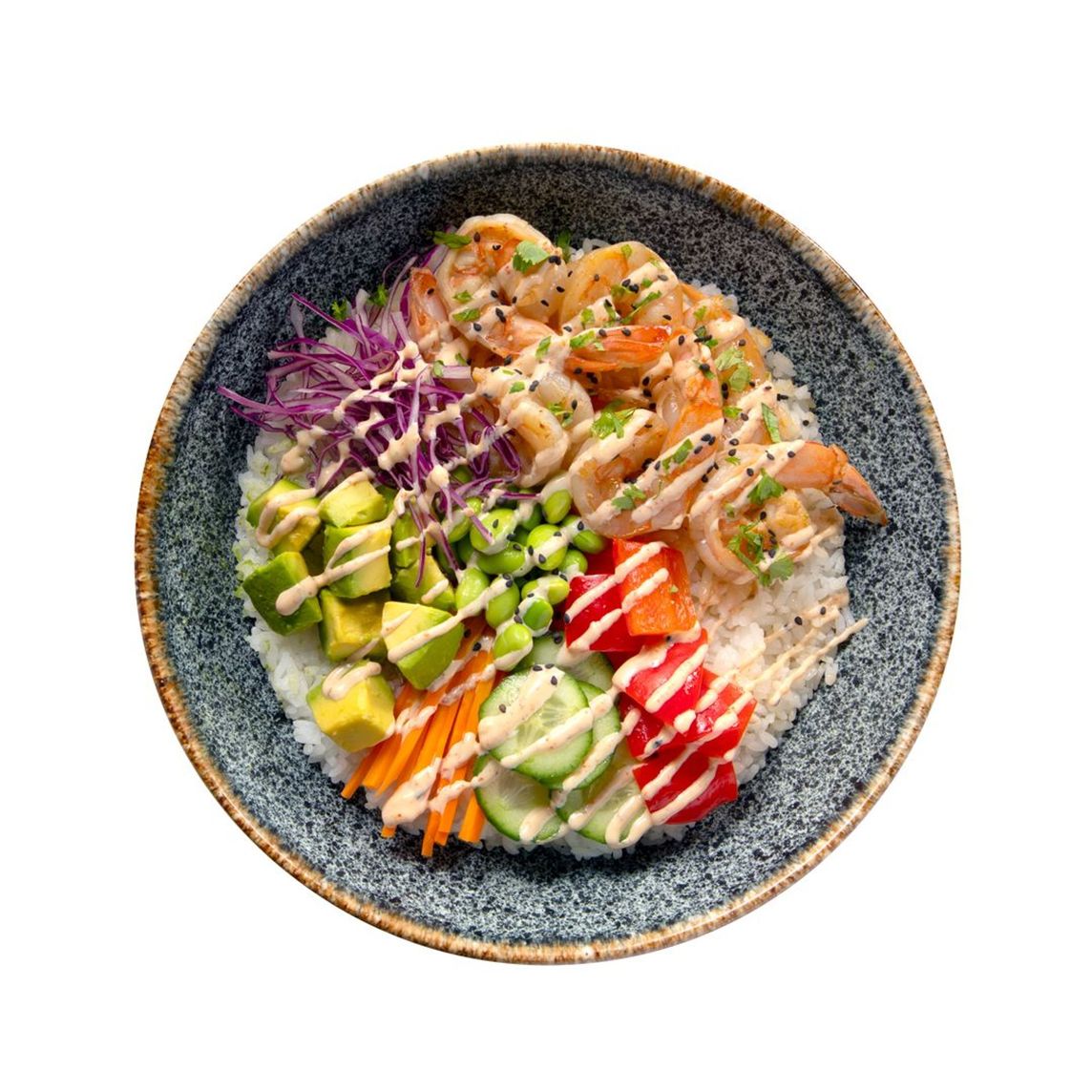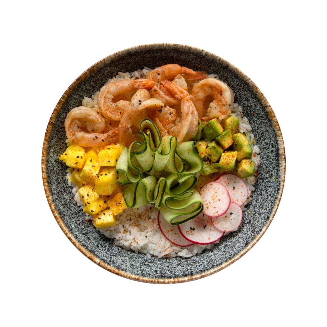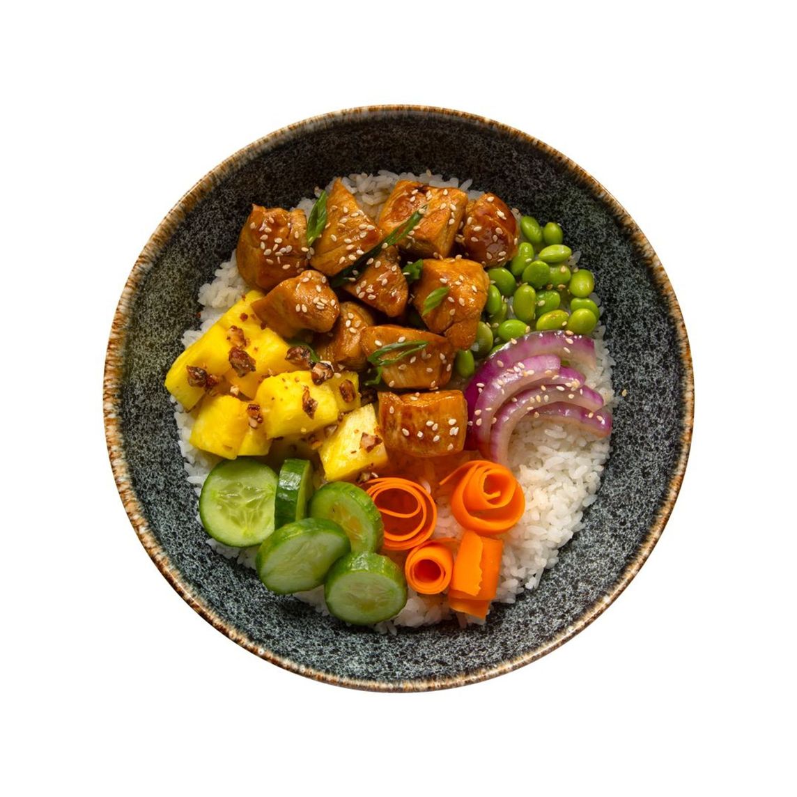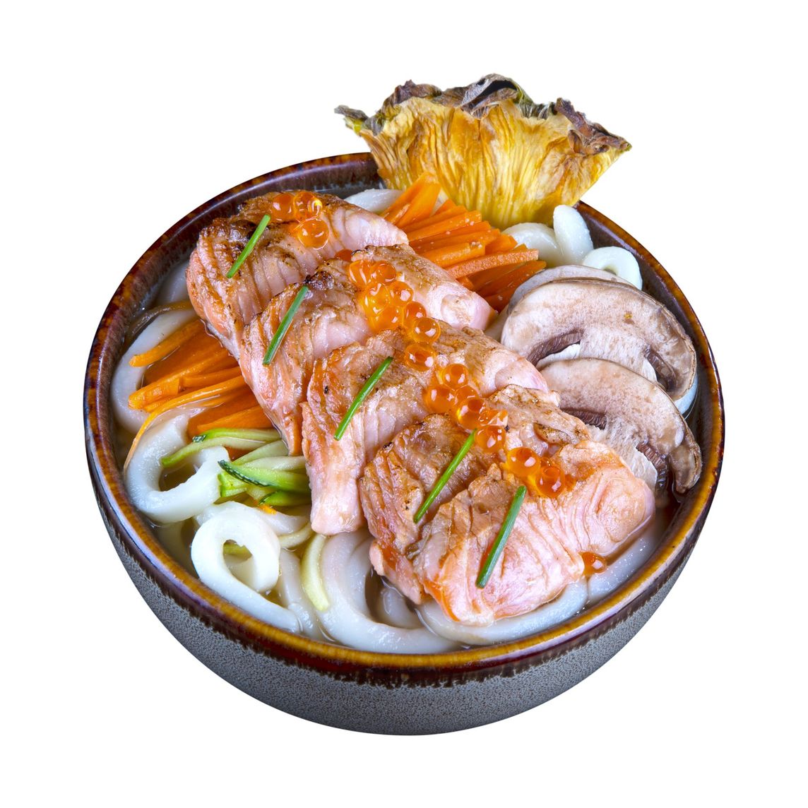 Servida con salmón (40g) y vegetales a la plancha, ikura, cebollín, piña deshidratada, udon y fondo miso. (300 ml).