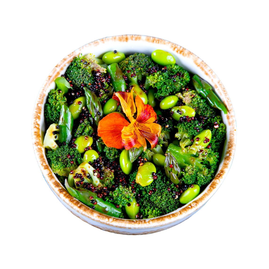 Espárrago, brócoli, edamame, quinoa, apio, salsa yakitori y flor comestible. (230 g)