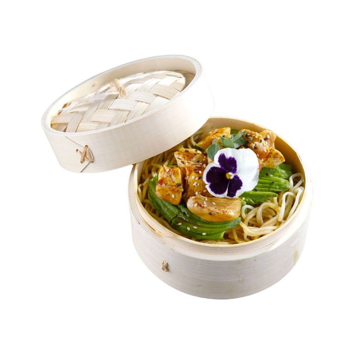 Pasta ramen con pollo teriyaki aguacate, ajonjolí mixto y flor comestible (60g)