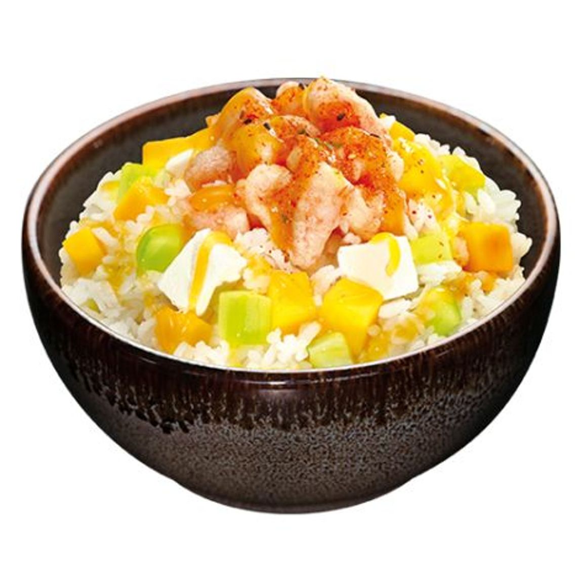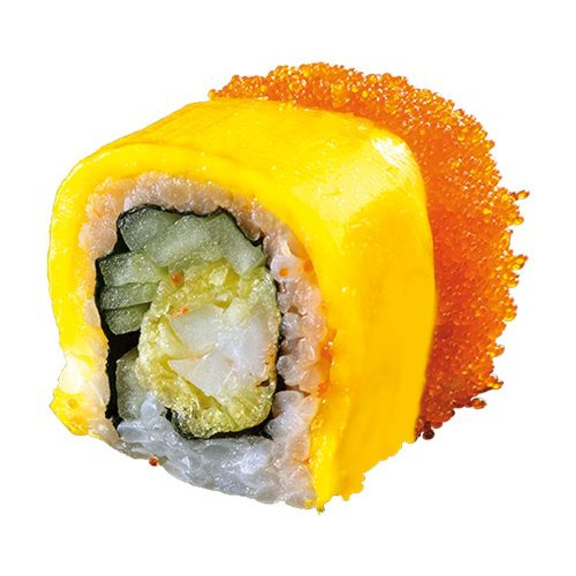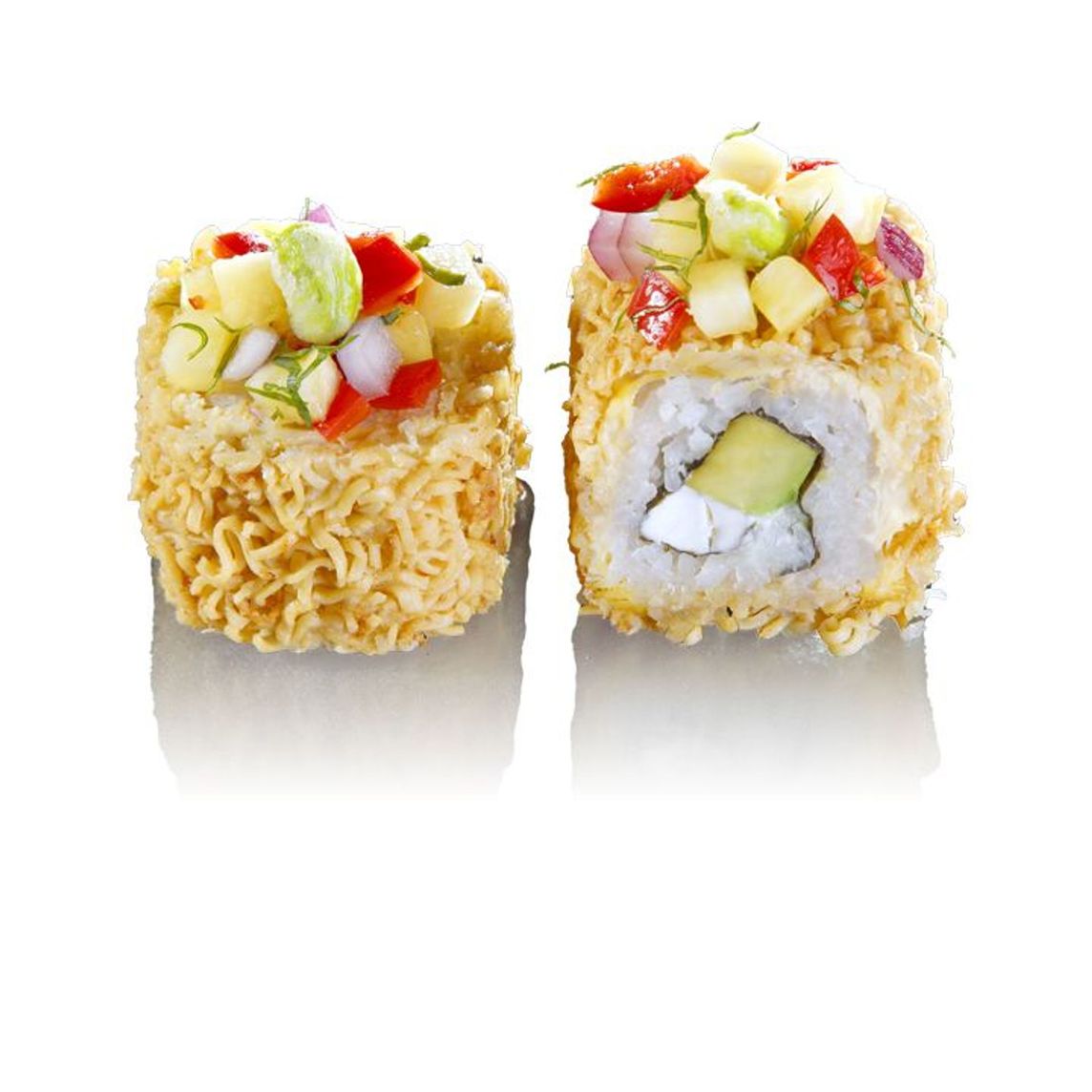 Con camarón tempura (2 pzas.), pepino, mango, shichimi, queso y salsa de mango.