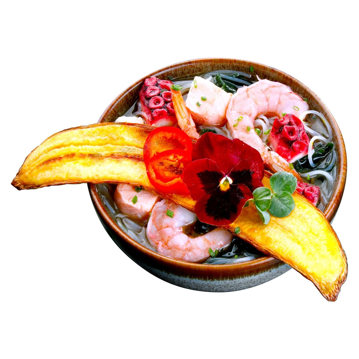 Sopa con Camarones (3pzas.), pulpo (20g), salmón (20g), alga, harusame, cebollín, chile rojo, plátano frito y flor comestible. 300ml