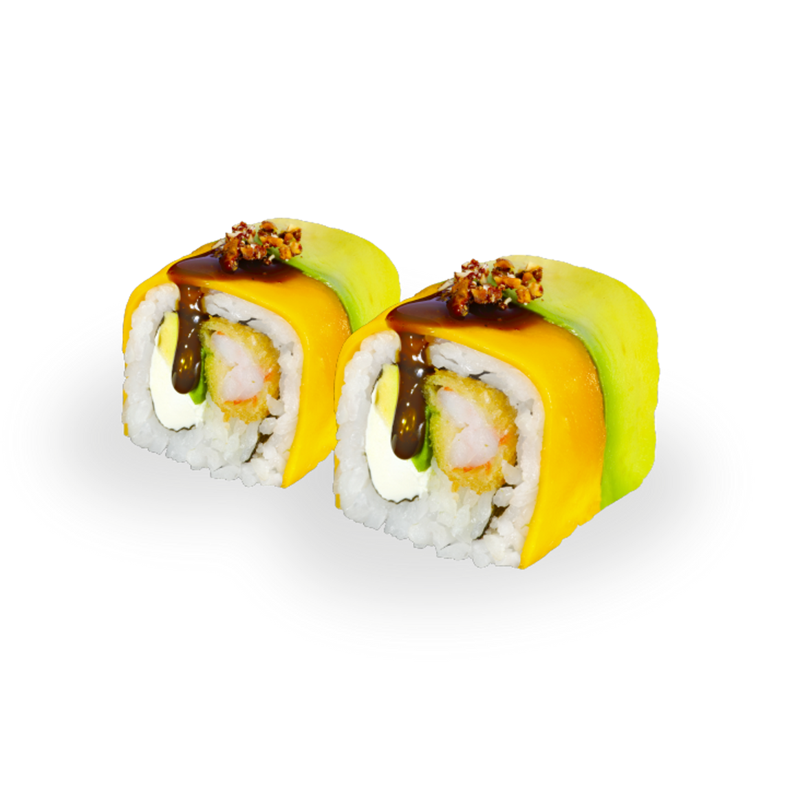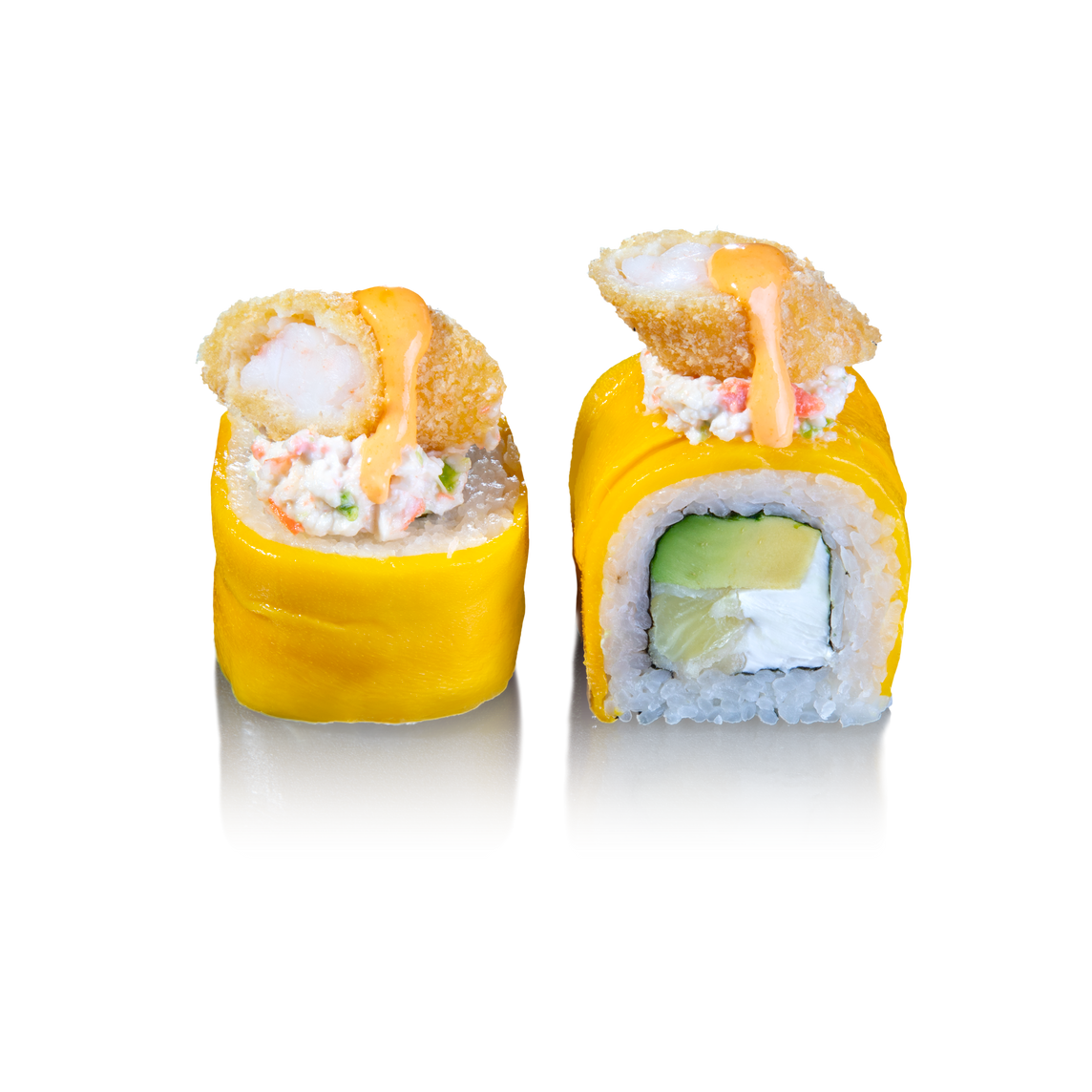 10 pzas. Topping: Mango y salsa chipotle. Por dentro: Camarón tempura, aguacate y queso.