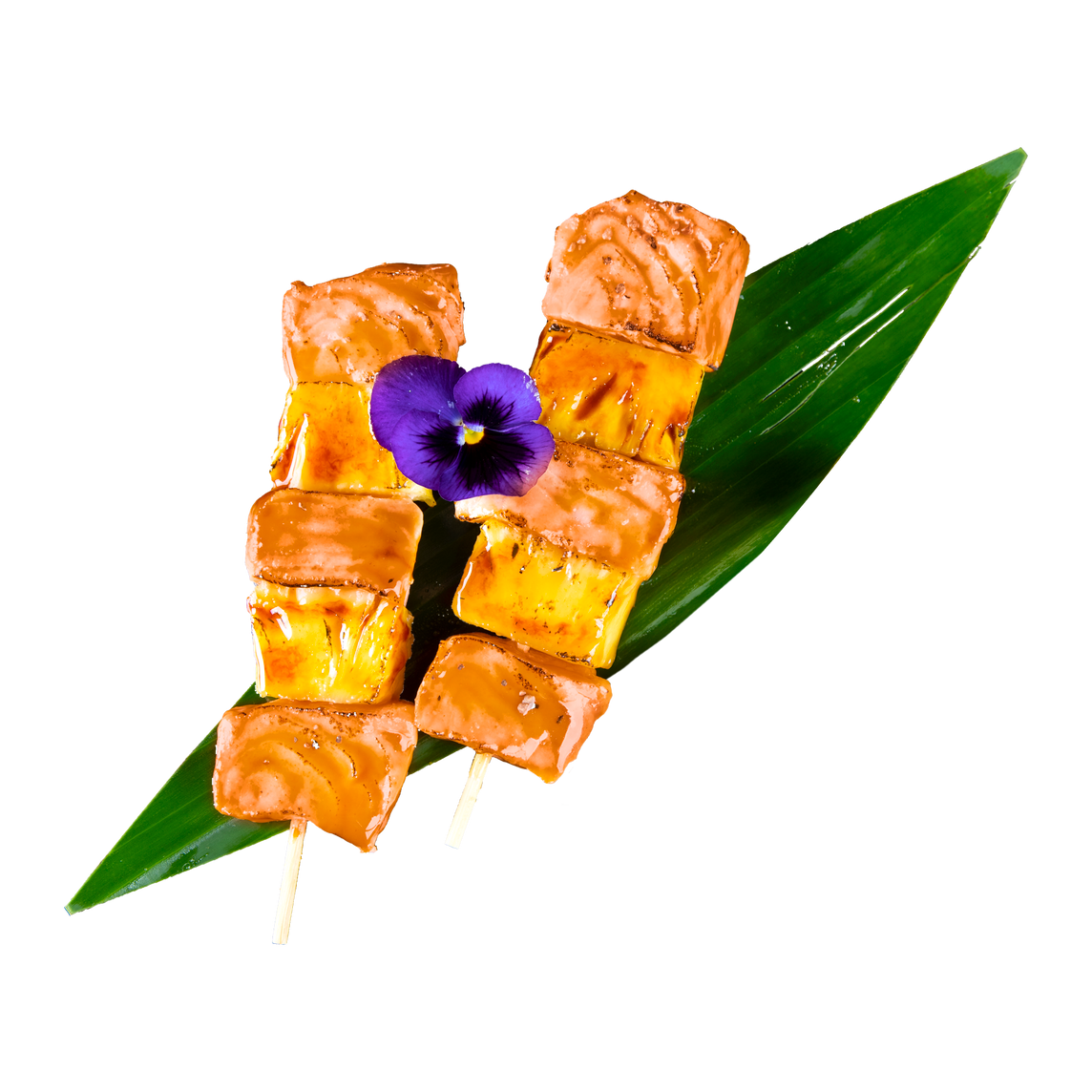 Brocheta a la parrilla con salmón sellado (60g), piña asada y miso dulce.