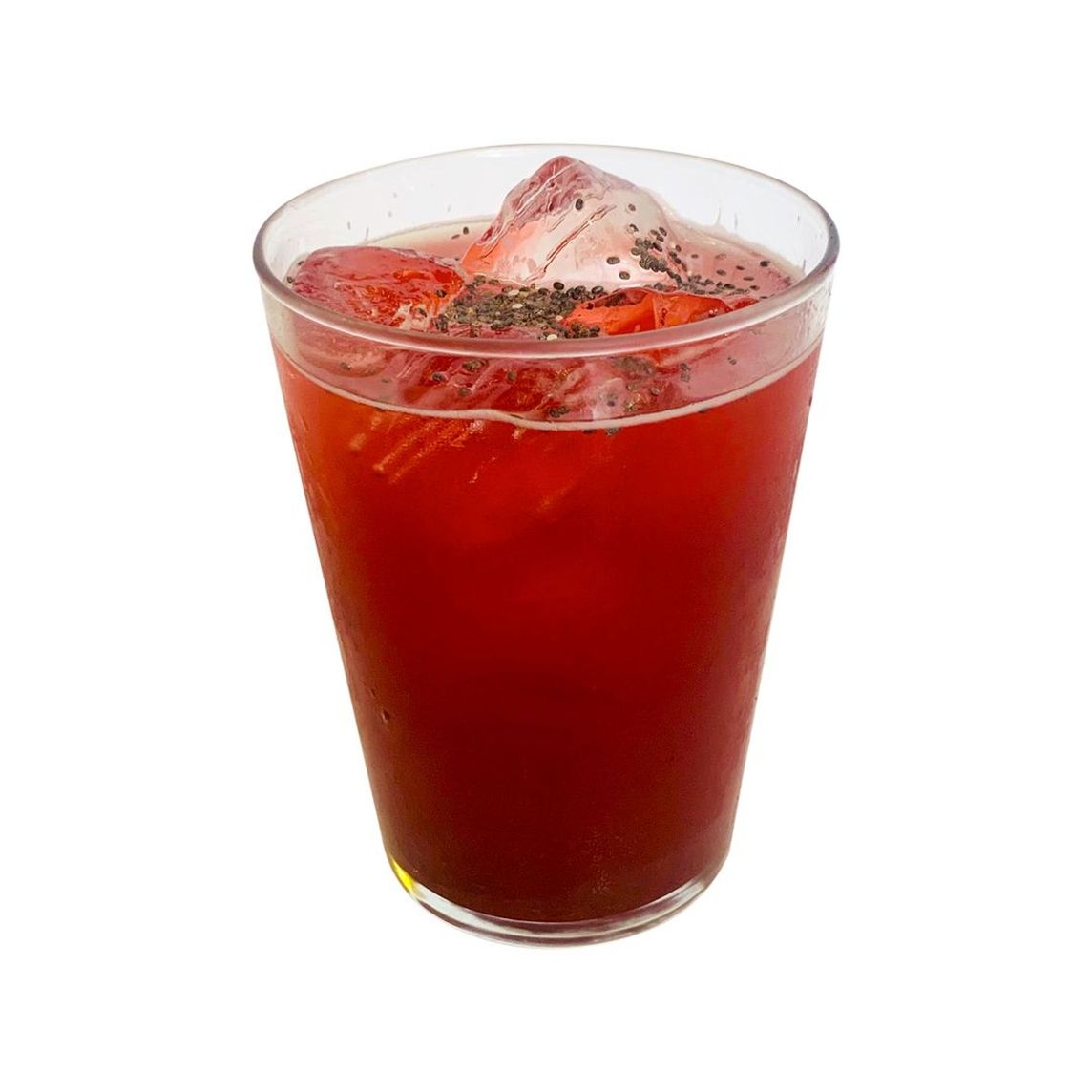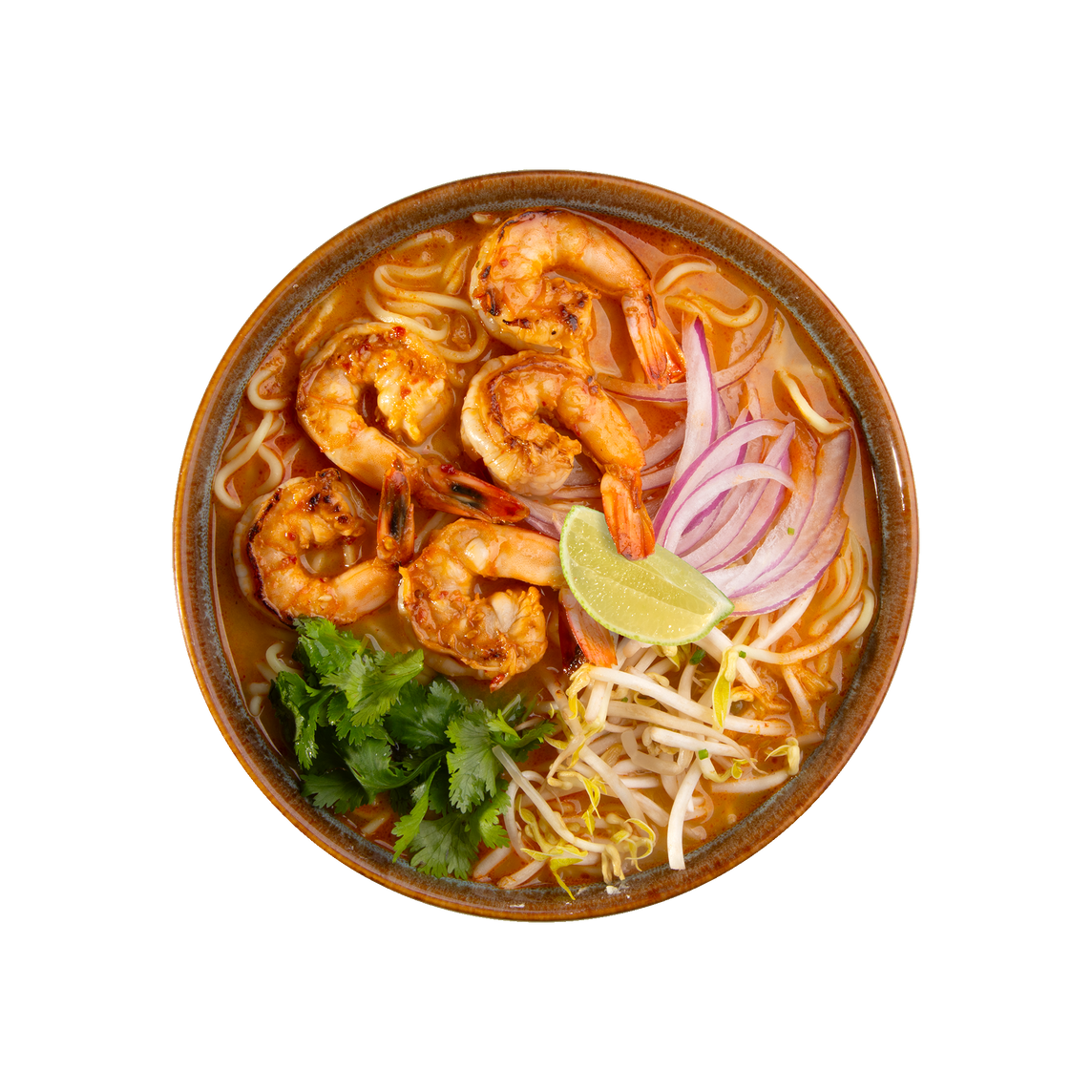 Fondo tom-yum, camarón (6 pzas.), cebolla morada, germen de soya, cilantro y limón.