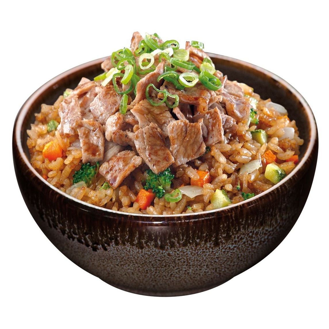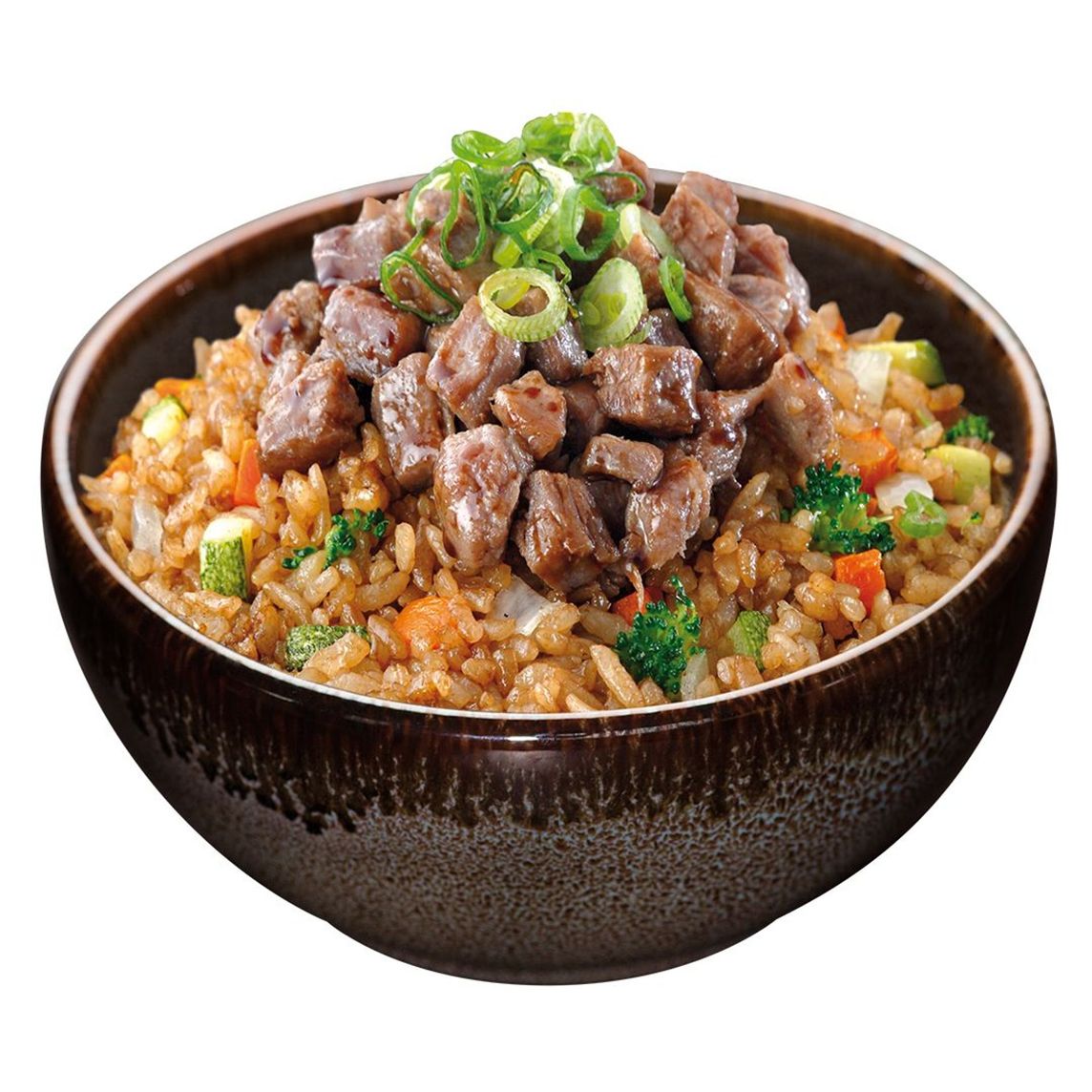 Arroz frito con verduras, huevo, rib eye (50 g) y cebollín.