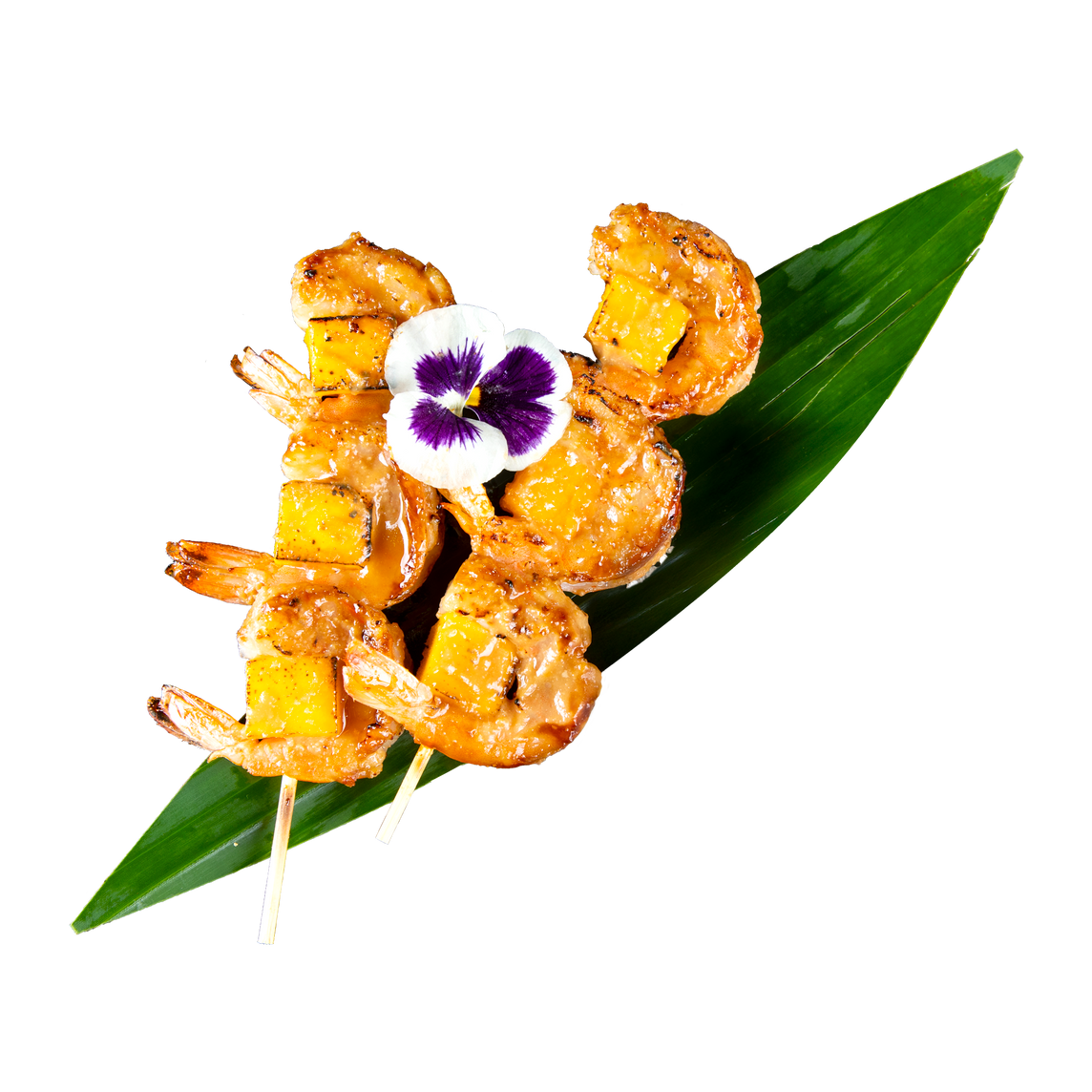 Brocheta a la parrilla con camarón (6pzas.), mango asado y miso dulce.