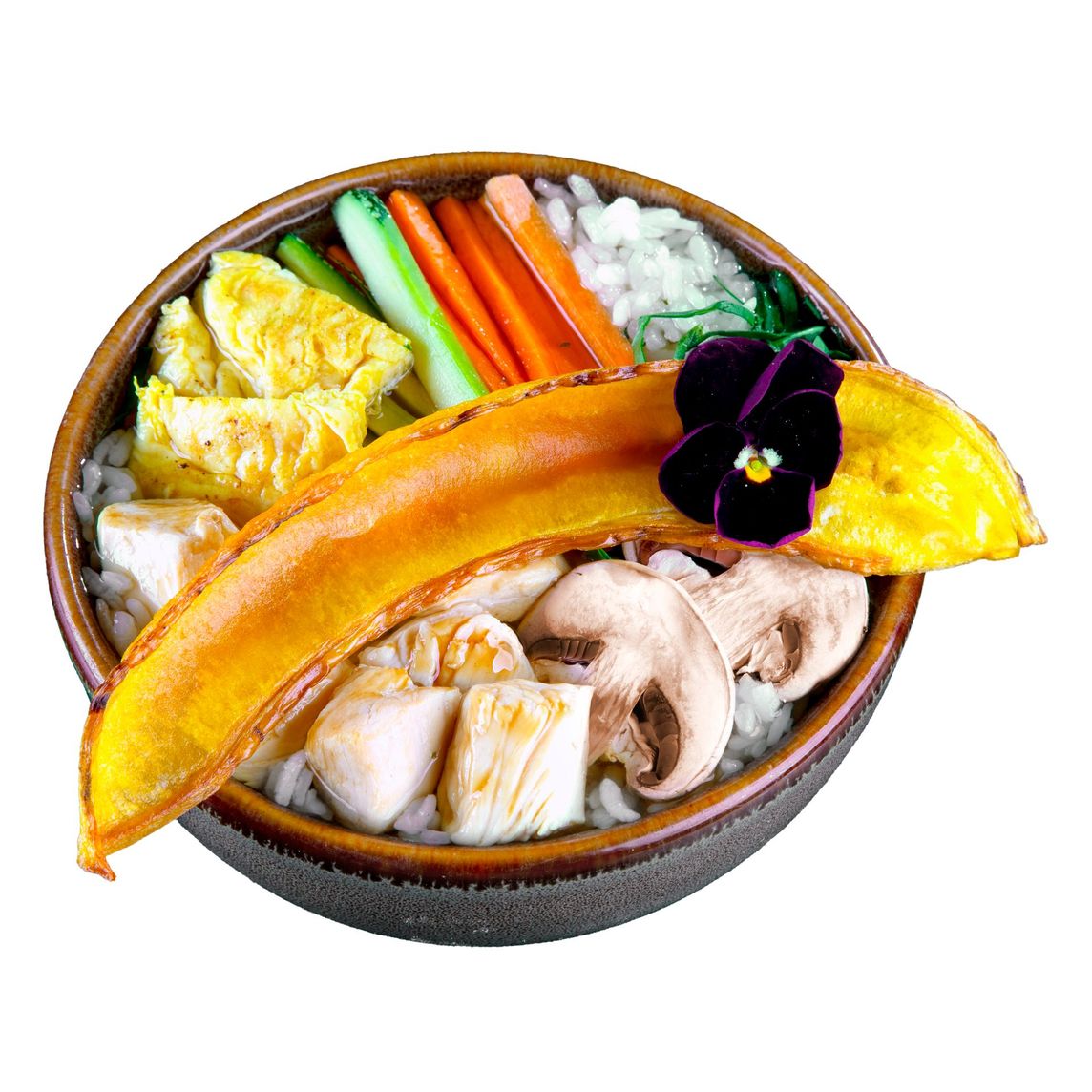 Con pollo (40 g), huevo, gohan, vegetales, flor comestible y plátano frito. (300 ml).