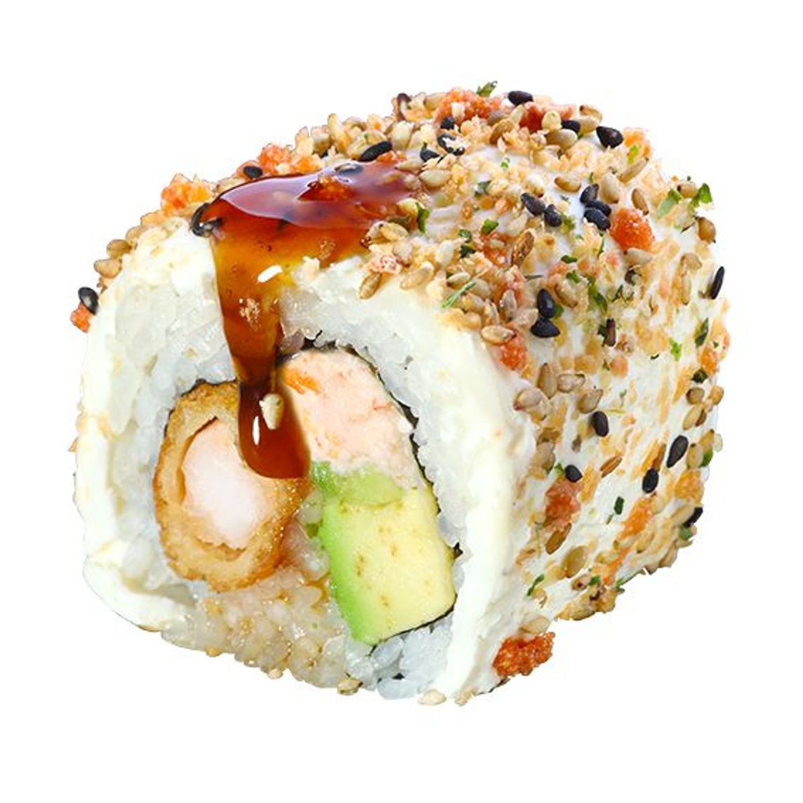 10 pzas. Topping: Camarón tempura, ajonjolí mixto, tampico y salsa de anguila. Por dentro: Pepino, aguacate y queso.