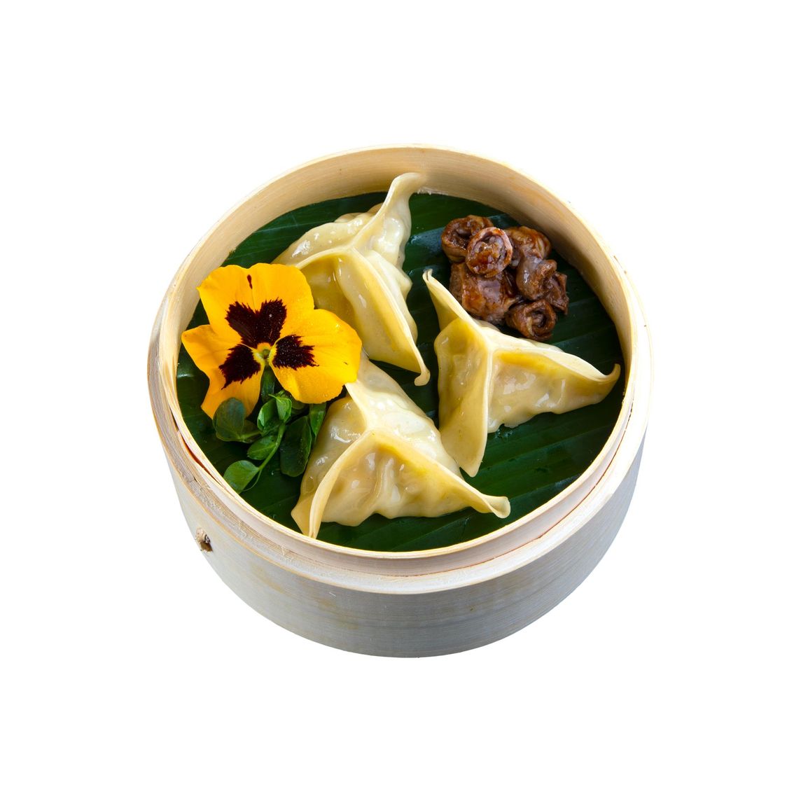 Gyozas de rib eye al vapor a la plancha o fritas (3 pzas.), sobre hoja de plátano, acompañado de salsa para gyozas y flor comestible.