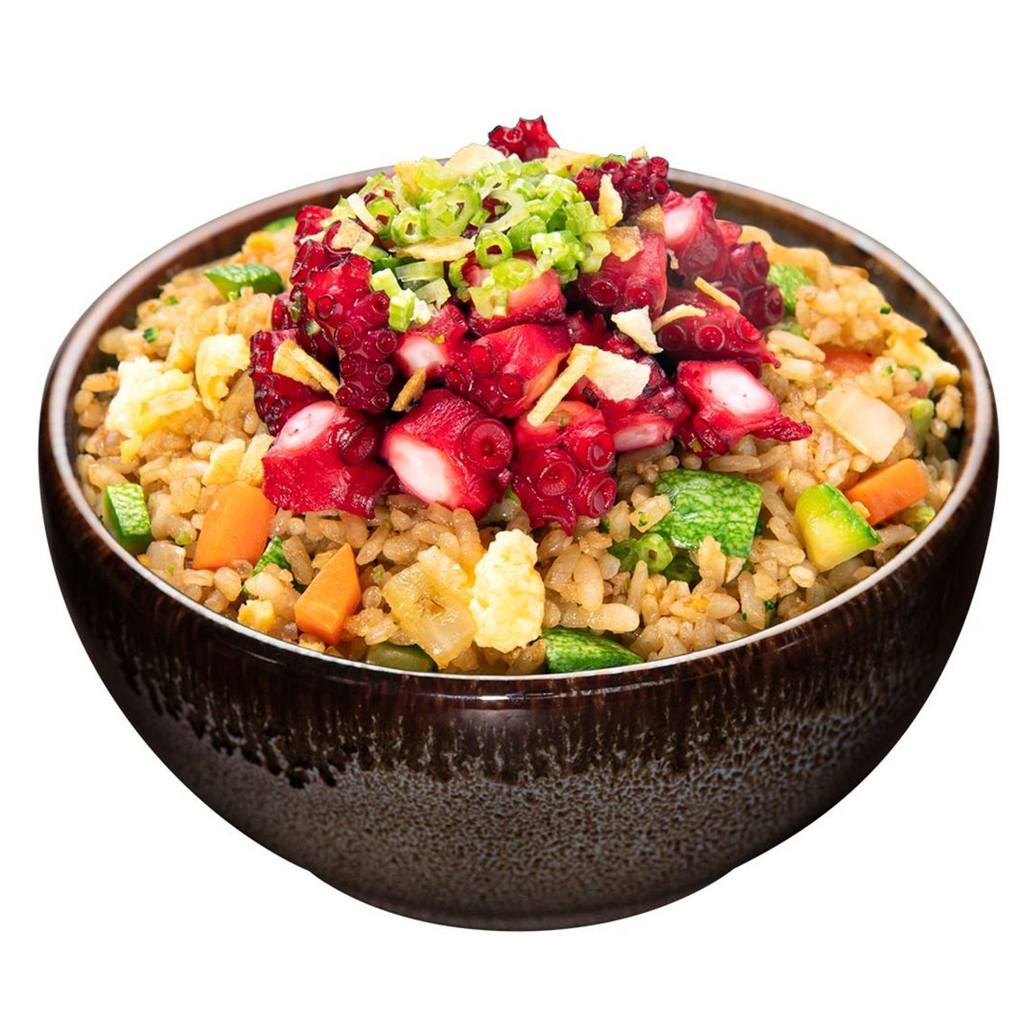 Arroz frito con verduras, huevo, pulpo al ajo y cebollín. (45 g)