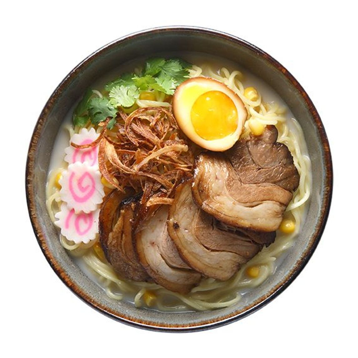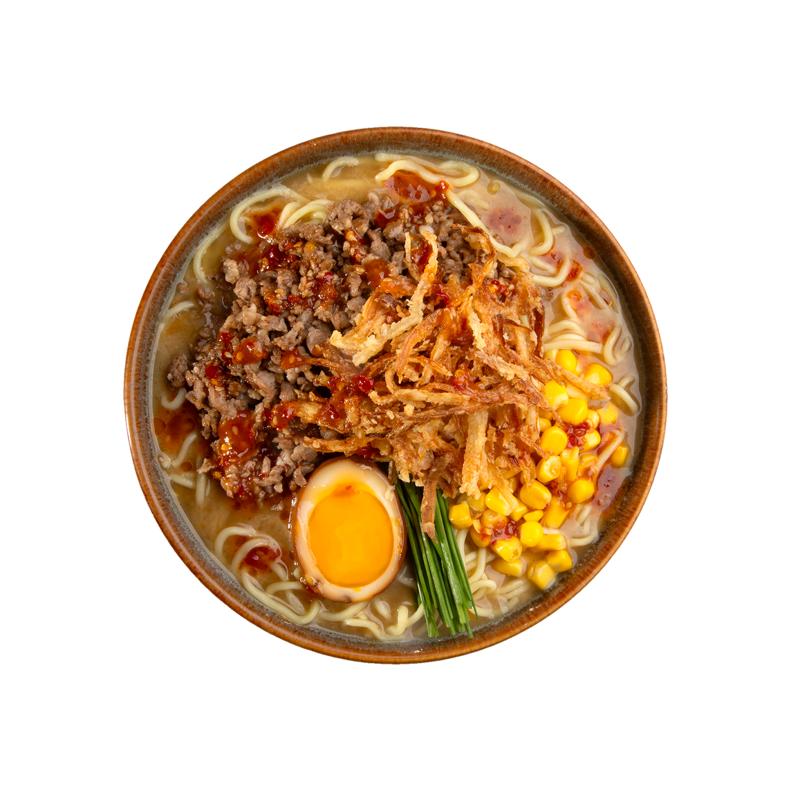 Fondo tonkotsu, pasta ramen, belly pork (100g), huevo marinado, elote, naruto, cebollín y alga nori.